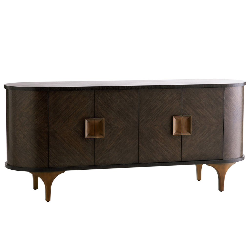 An heirloom-quality oval credenza crafted from eucalyptus veneer in a brindle-finished diamond facade, contrasted with sable oak trim and oversized vintage brass hardware. Features two-door storage with an adjustable shelf; wood finish will vary.