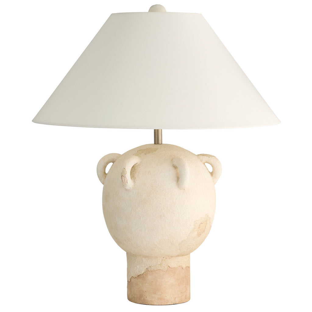 An antique olive vessel from the Mediterranean informed the classical shape and the Tuscan washed finish of this terracotta lamp. Finished with dark antique brass-plated steel hardware and a tapered shade of ivory microfiber lined in matching off-white. Finish will vary.