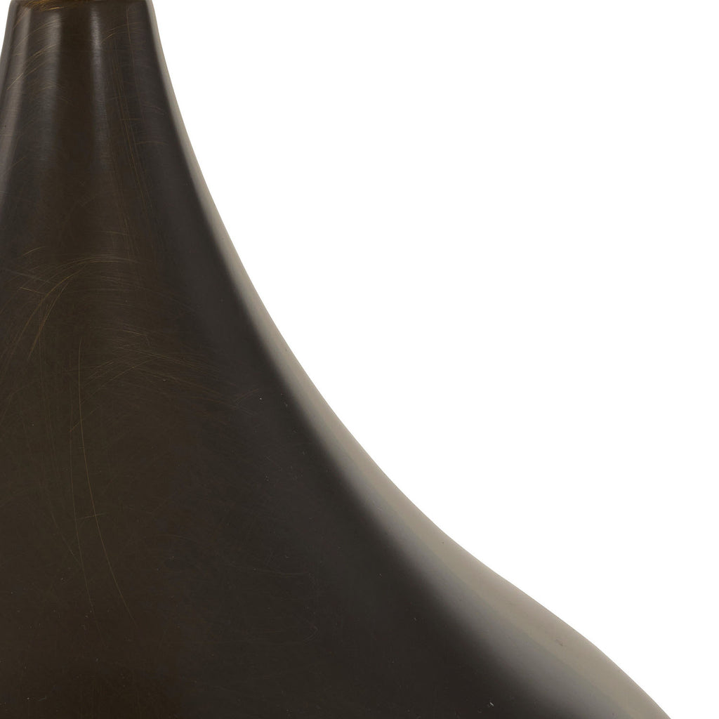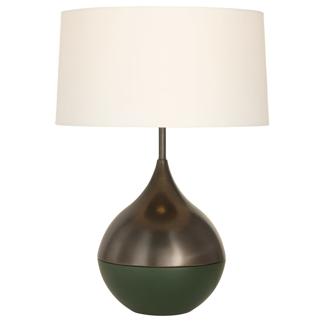 This mid-century modern–inspired lamp combines dark spruce and bronze-plated aluminum in a seamless design. The classic bulb base features a striking two-tone finish with bronze-plated steel hardware and is topped with an off-white cotton drum shade with matching lining.