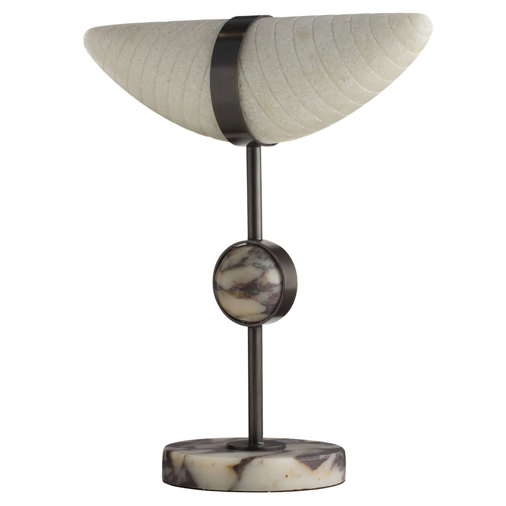Artifact-inspired, this elegant piece features a grooved horn of ivory ricestone composite that adds exotic impact to an entryway, console, or credenza. Held by a band of bronze steel and secured to a sculptural base of Calacatta Viola marble, it offers an intriguing mix of textures and materials. Finish will vary.