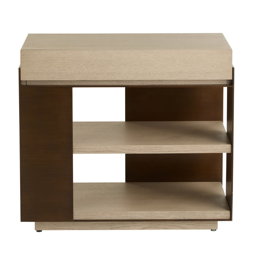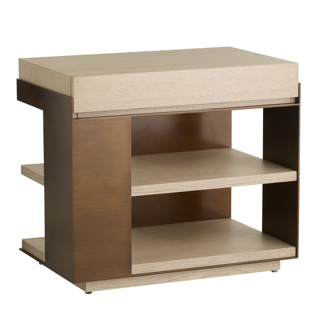 Our end table of smoke oak veneer offers effortless multi-functionality. Stylized with a lighter-grained top and dual shelves, it also features a soft-close drawer hidden in the front to store your essentials. A vintage brass stainless-steel frame and hardware. Finish will vary.