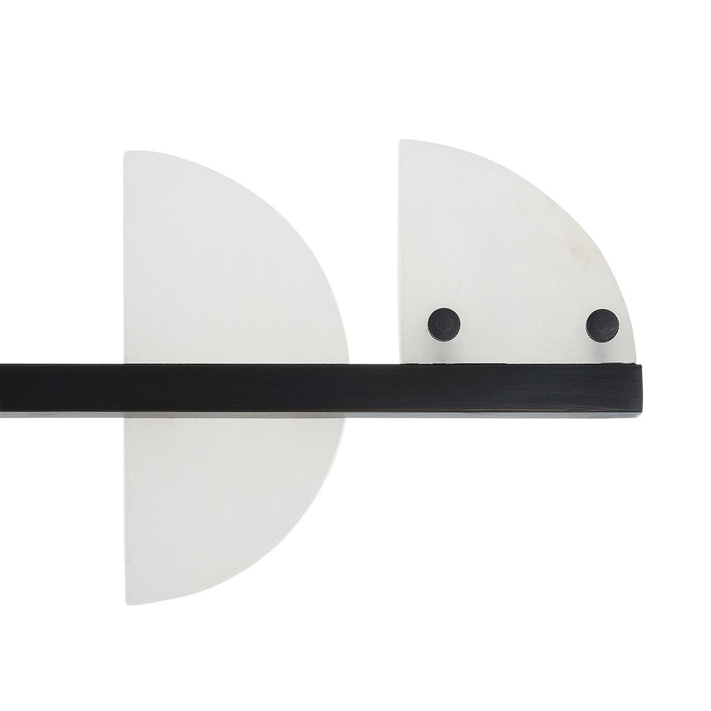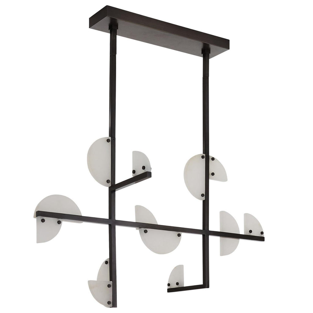 From the waxing crescent to the new moon, lunar phases have informed our modern LED style. Half- and quarter-circles of white alabaster are secured to architectural rods of English bronze-plated iron, allowing each disc to emit a jewel-like glow where it meets the metal. Certified for damp locations and intended for interior use. Finish will vary.