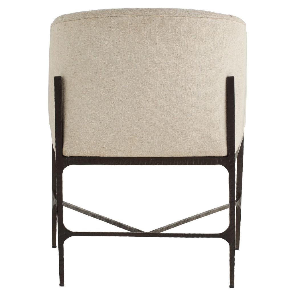 Our ultra-chic Osbourne in a smart Oxford white textural performance fabric. The low, barrel-style shape gives lumbar comfort and support while allowing the chair to tuck neatly under a dining table. The hammered blackened iron frame’s modern style brings sophistication and polish to a space. Hammered finish will vary.