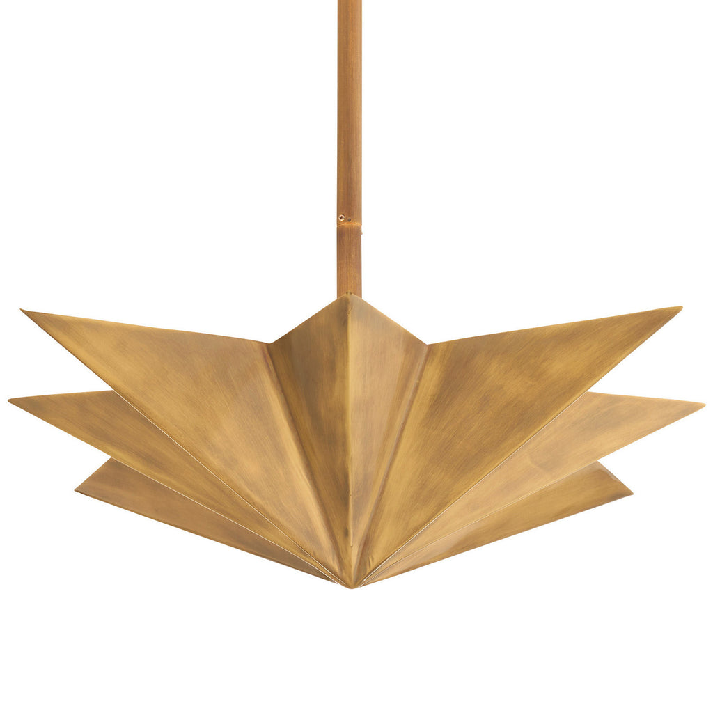 This sculptural eight-point star pendant is crafted from solid antique brass, offering a luminous glow from four candelabra bulbs. Ideal for rooms with lower ceilings. Additional pipe available (PIPE-167). Finish will vary.
