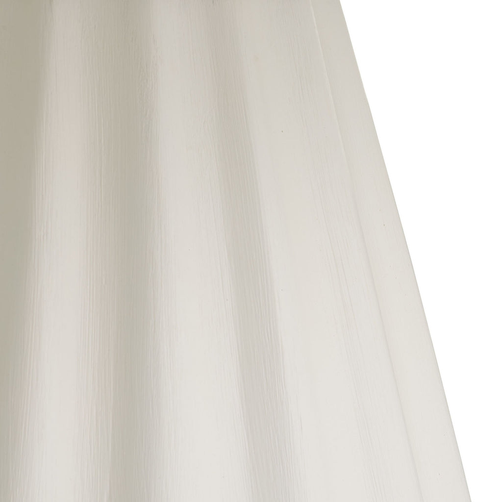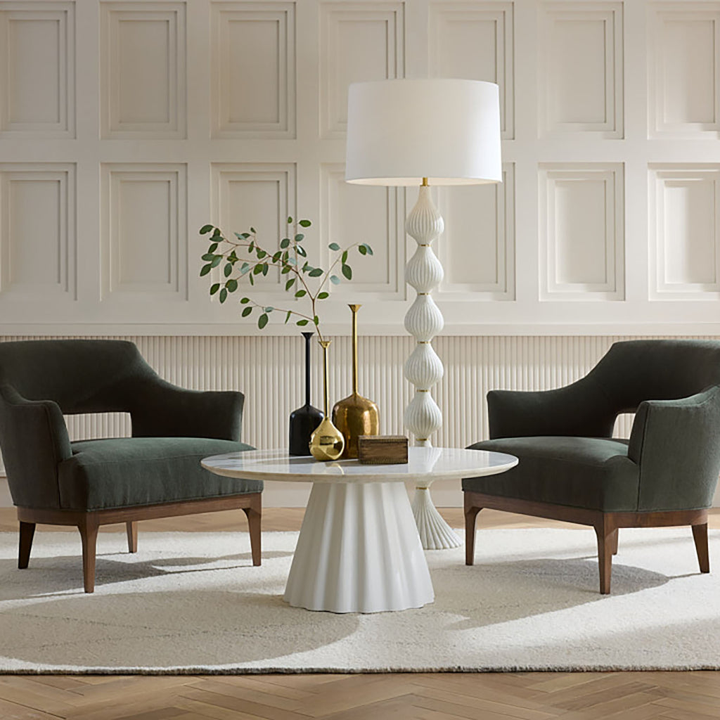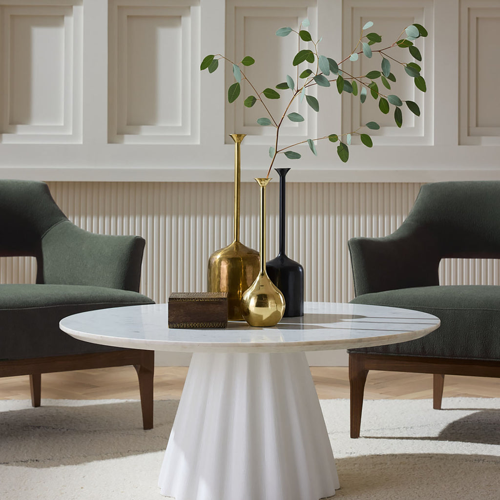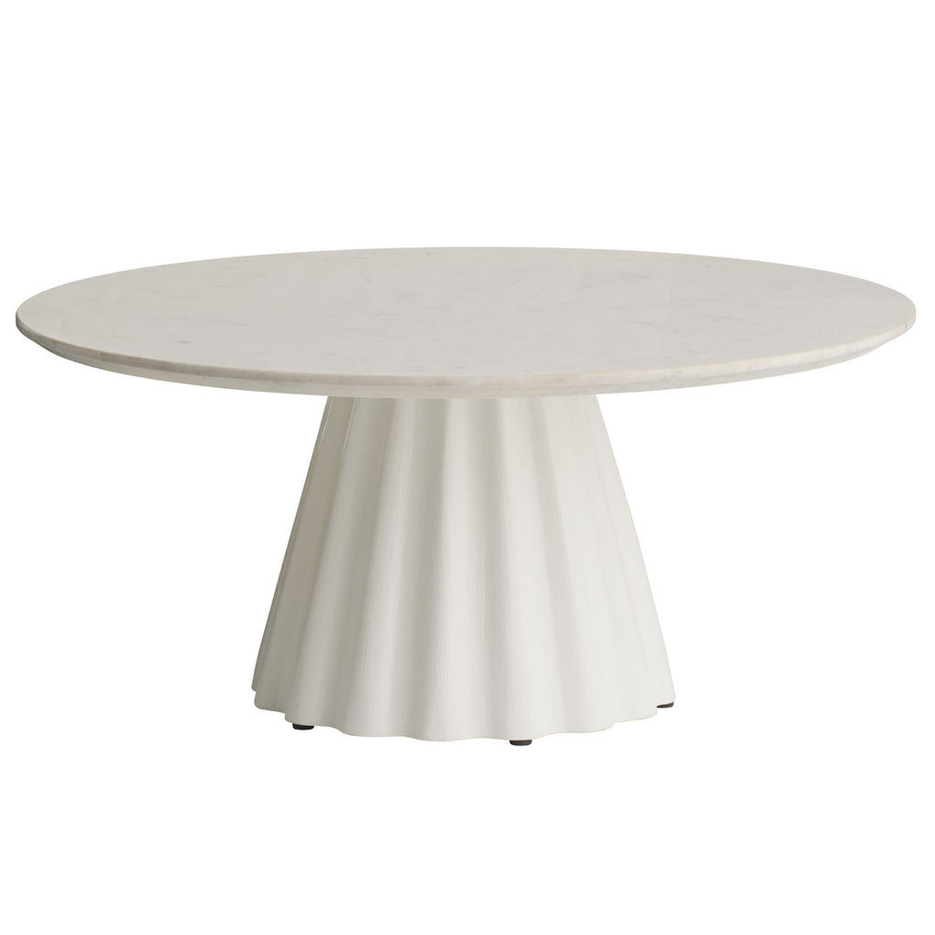 This sleek style is an elegant addition to any living room. Designed with a white marble top that sits atop a tapered, ridged base of matte white gesso mango wood, this table was inspired by the draping in fabric to capture light and shadow. The bright white pedestal table is a fresh and impactful option for any space. Finish will vary.