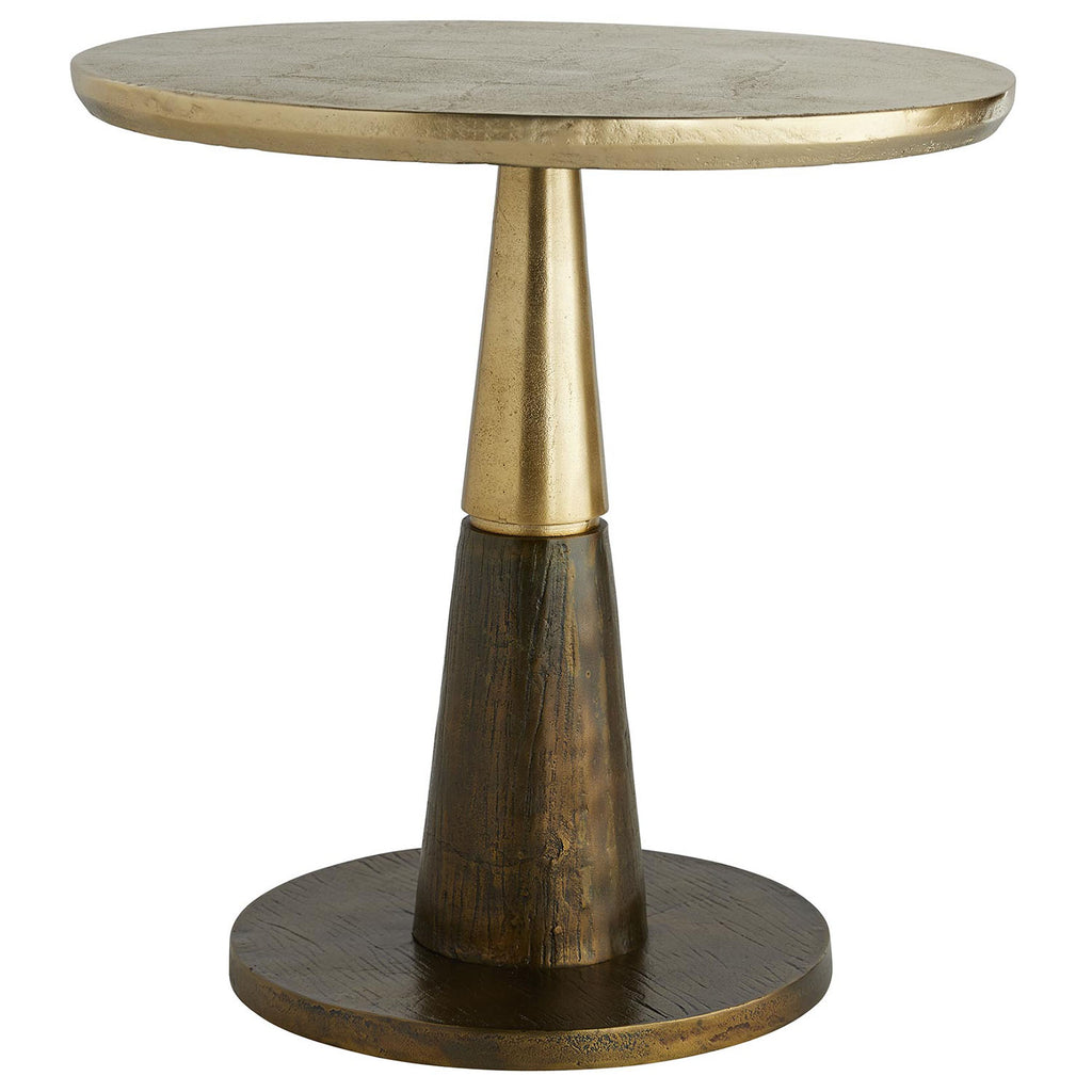 Split between two tones, this side table is a modern wonder. The lighter top is an antique gold, where the bottom section is done in a burnished gold, adding the immense level of sophistication and craftsmanship. The table top is crafted with a sandblasted texture and the top of the base is molded to a heavy woodgrain pattern, so texture and intrigue are immense throughout the piece.