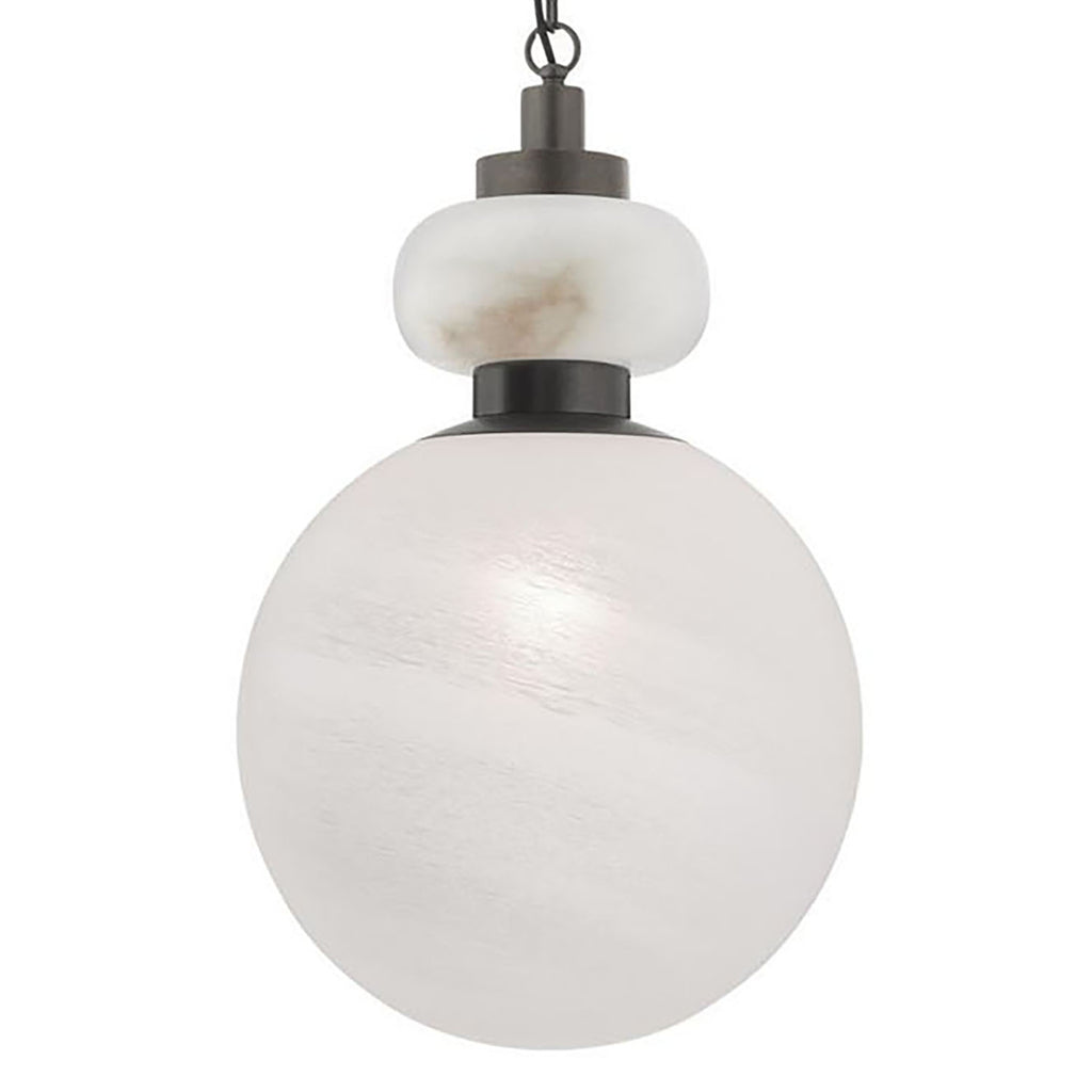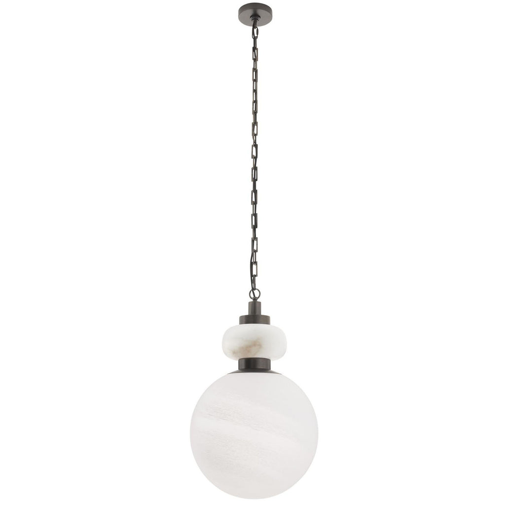 This pendant casts a soft glow of luxurious matte swirl glass, topped with white alabaster. Rendered in a totemic silhouette, the Rosemont is accented with an English bronze-plated iron band and decorative rectangular chain links. Certified for damp locations and intended for interior use. Finish will vary.