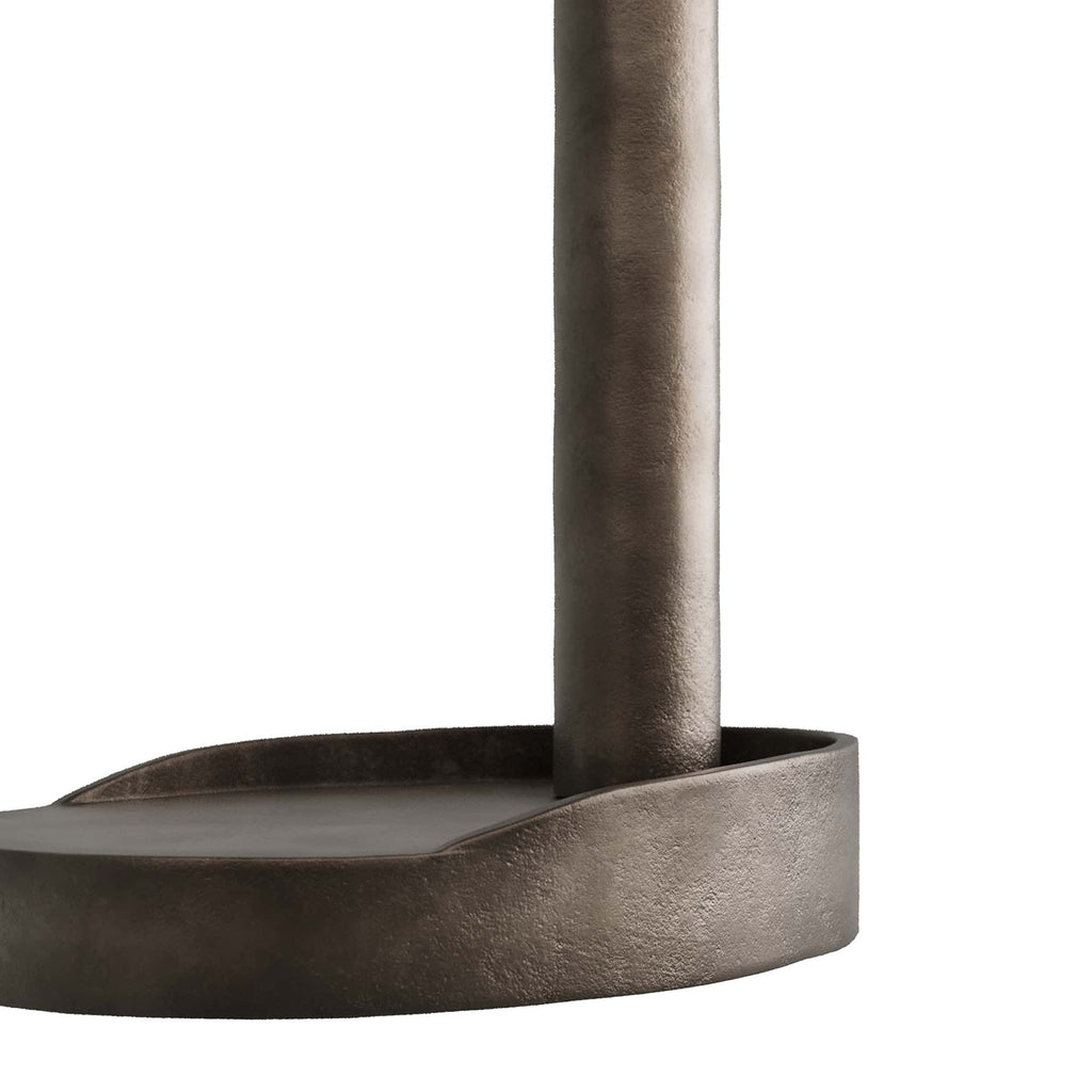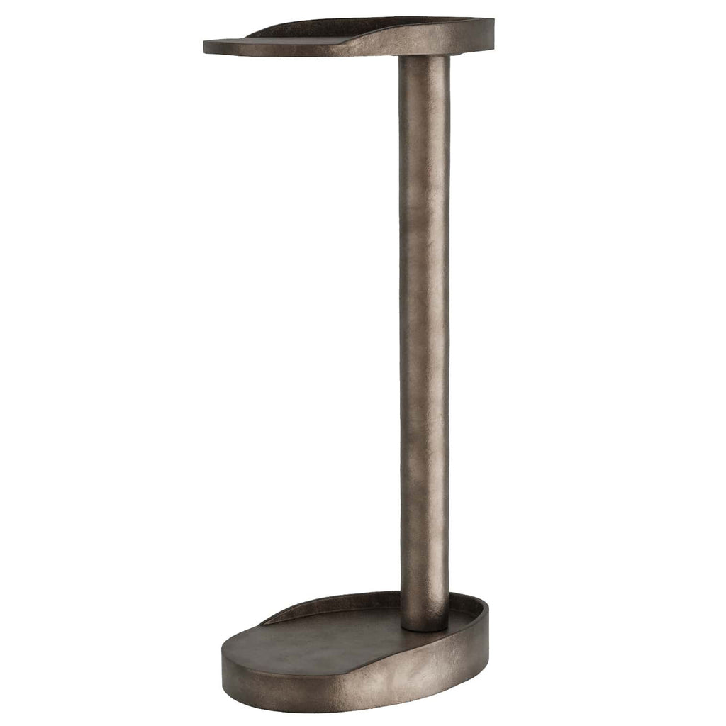Our Arteriors Slade drink table makes a stylish resting place for a martini. Graphite aluminum is molded in a teardrop shape with an offset silhouette. Versatile and small-scale, the pedestal accent can tuck into any space in need of a little edge.