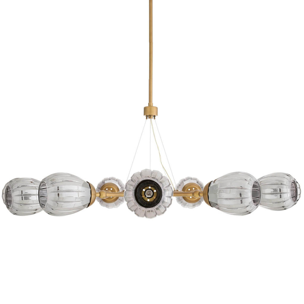 Reimagined in a circular format, the Smyth Round Chandelier combines fluted smoke-luster globes with an antique-brass steel frame, suspended on aircraft wires. Damp-rated; finish may be affected by outdoor environments. Finish will vary.