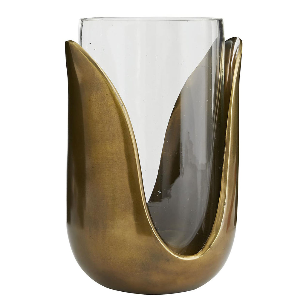 Sculptural vases nestled in cast aluminum tulip petals, finished in antique brass—includes two clear glass inserts that can also serve as candleholders. Finish will vary.