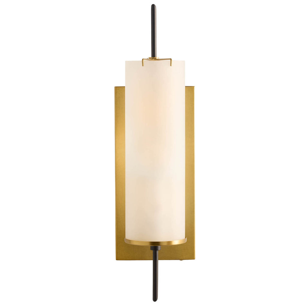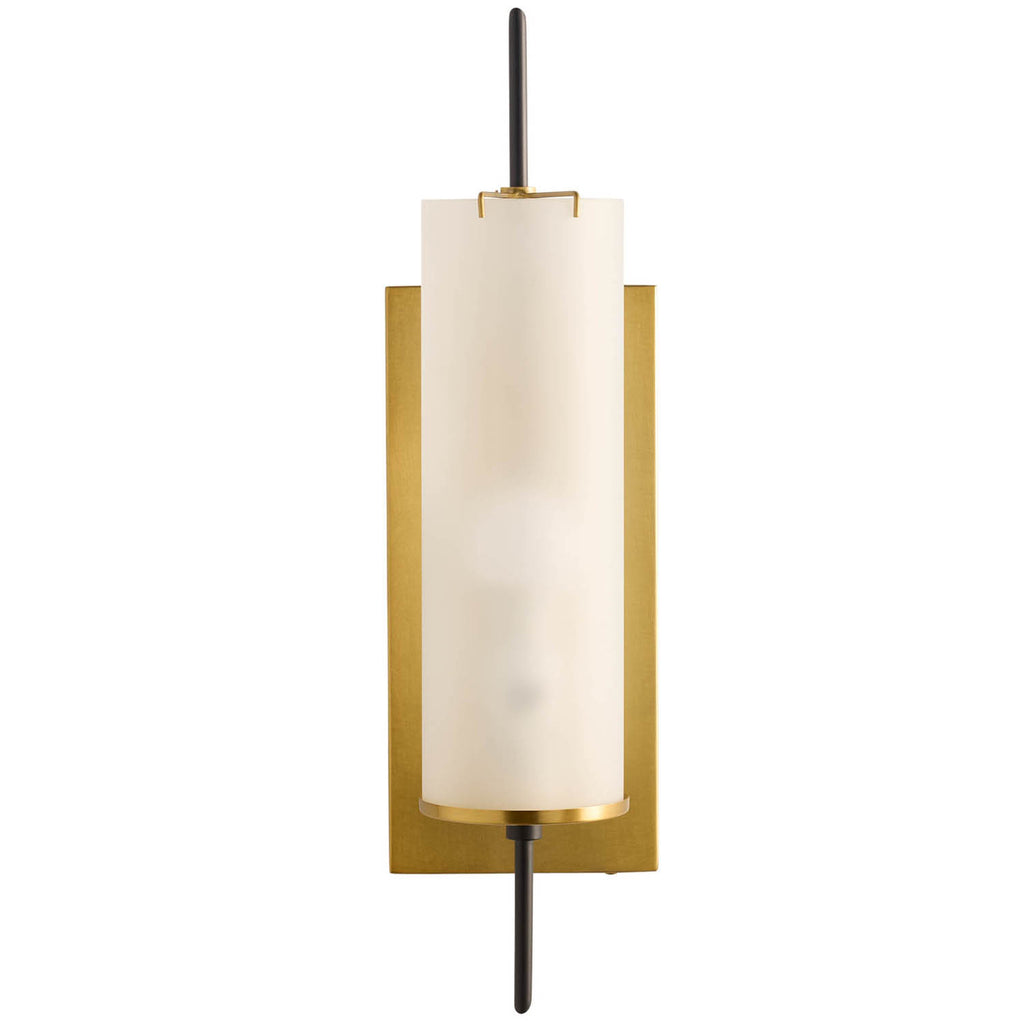 A refined wall sconce combining antique brass, bronze accents, and a frosted glass shade, inspired by the Stefan floor torchiere; damp-rated for covered outdoor interiors. Finish will vary.