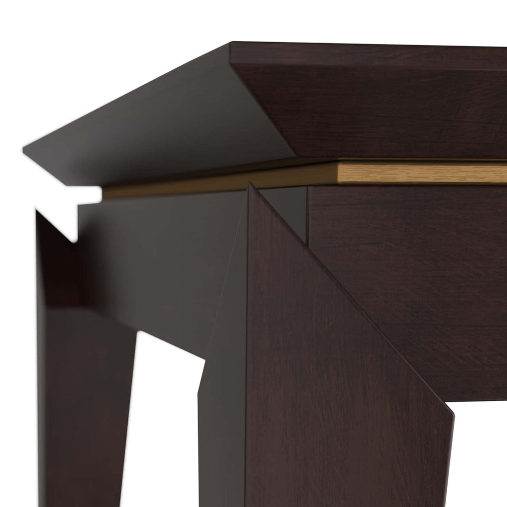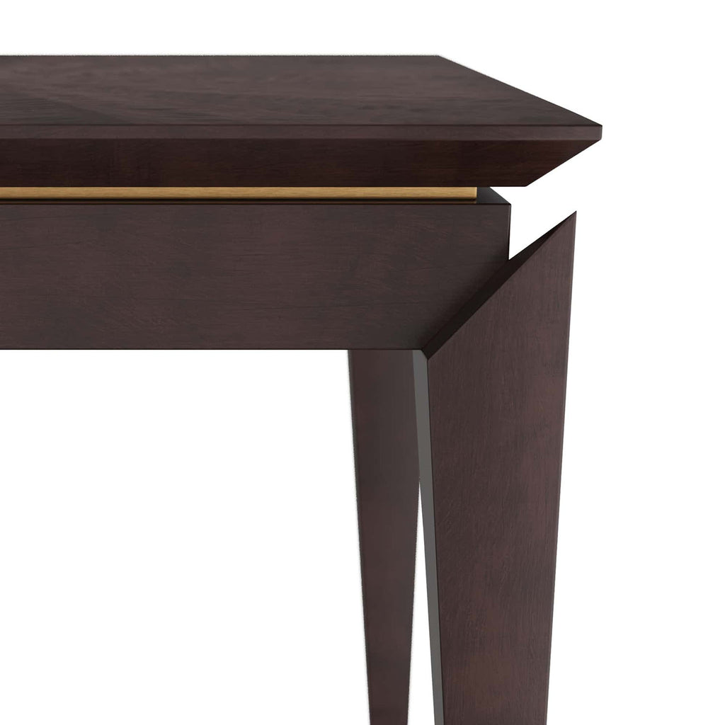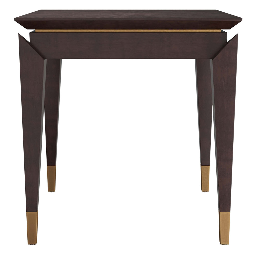 The masterfully crafted, vintage inspired Arteriors Tarten end table makes a stunning addition to any style interior. Crafted in brindle eucalyptus veneer, the square accent table features applied legs with severe angles that emphasize the antique brass reveal edging the surface. A beautiful, feathered radial pattern decorates the chamfered top. Finish will vary.