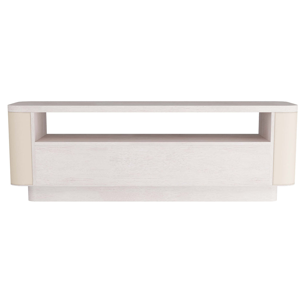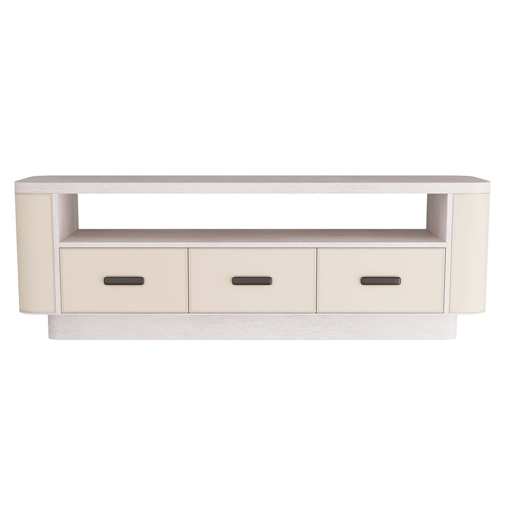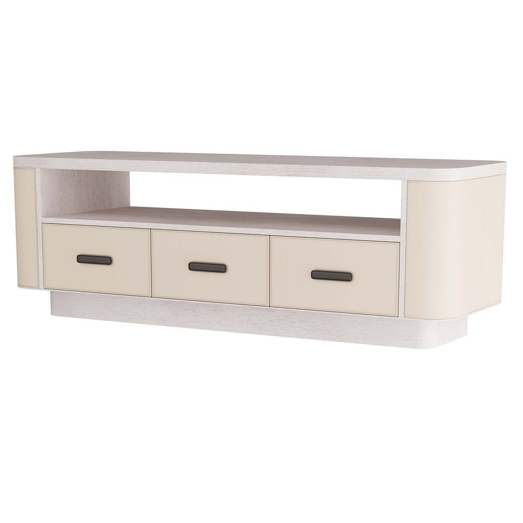 The Arteriors Teton credenza is designed in an elegant arrangement of tonal materials. The cabinet is crafted with a smoke oak case, with an open shelf and plinth. A trio of deep drawers, sized for media use and lined in cream suede, are clad in expertly stitched ivory leather. The credenza’s curved end caps are also dressed in ivory leather. Finish will vary.