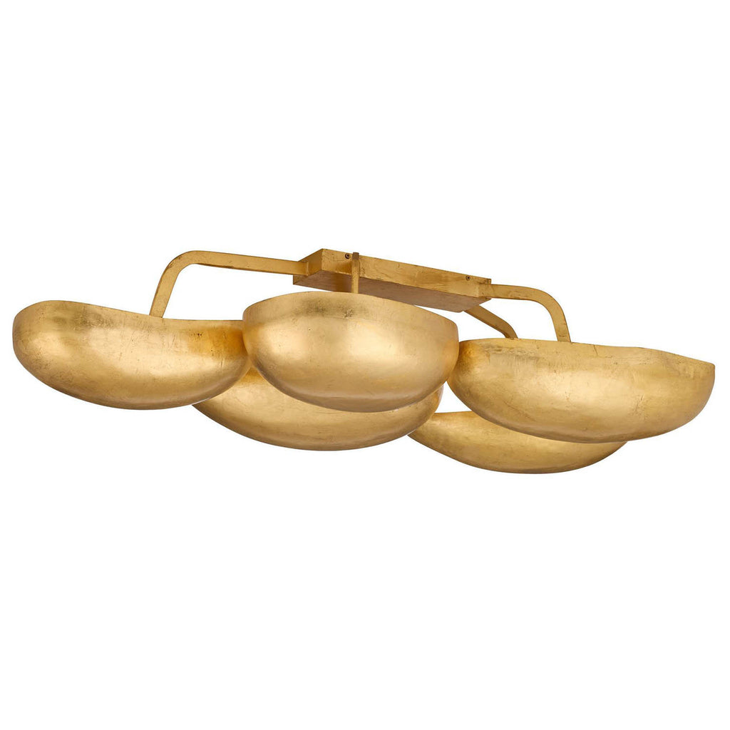 Featuring five sculptural inverted ‘pods’ across a sweeping gold-leaf iron frame, this 13-light flush mount blends organic form with opulence. Finish will vary.