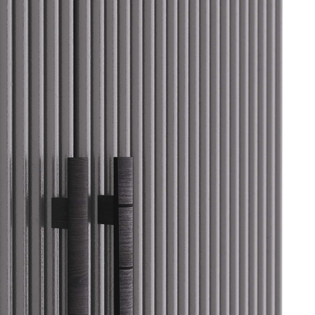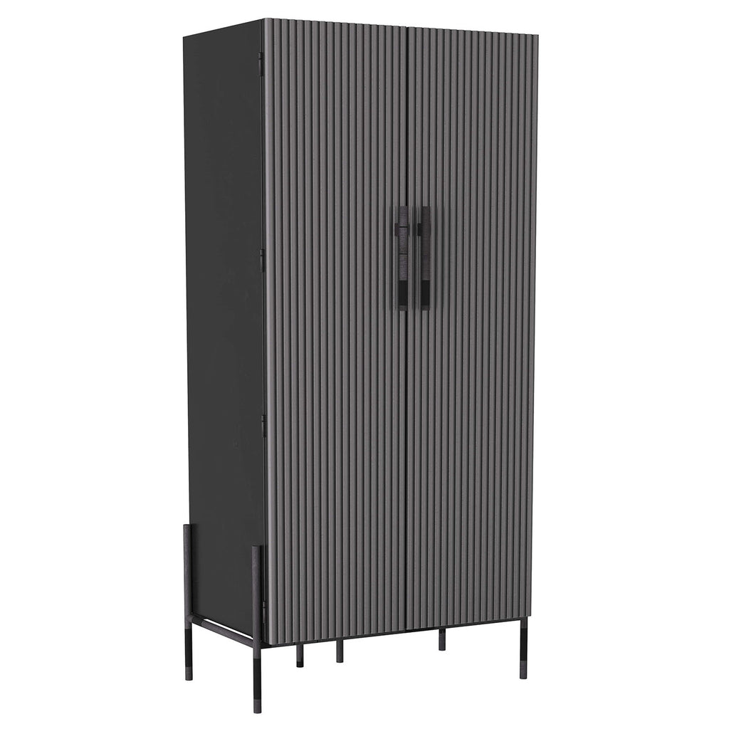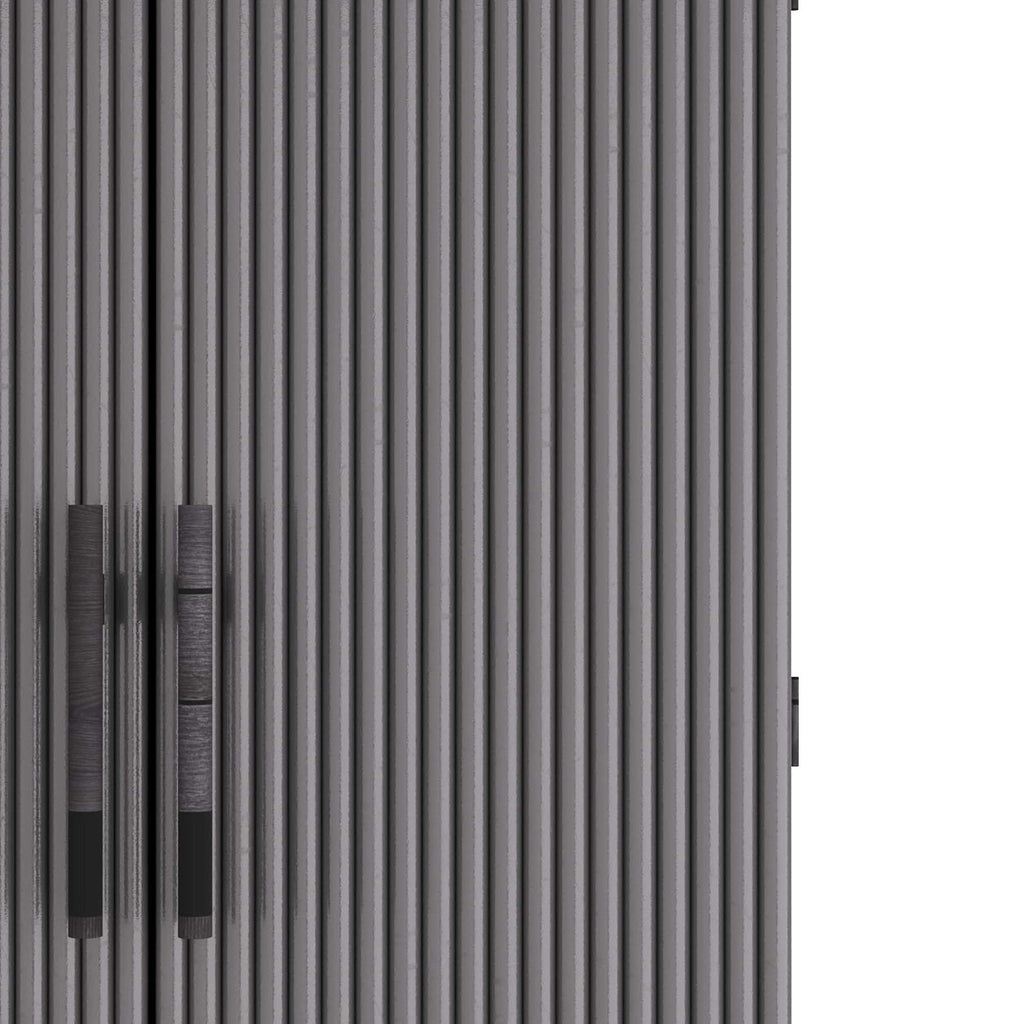 With old hollywood inspiration, the Arteriors Thurman cabinet is fashioned with a channeled, graphite leather exterior, imparting a sophisticated masculinity. The luxe cabinet is framed in ebony oak and features bronzed stainless steel tubular pulls and matching legs that extend vertically, becoming a decorative element. The piece is fitted with adjustable shelves in ebony oak. Finish will vary.