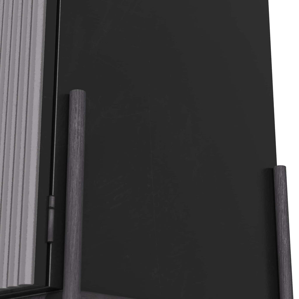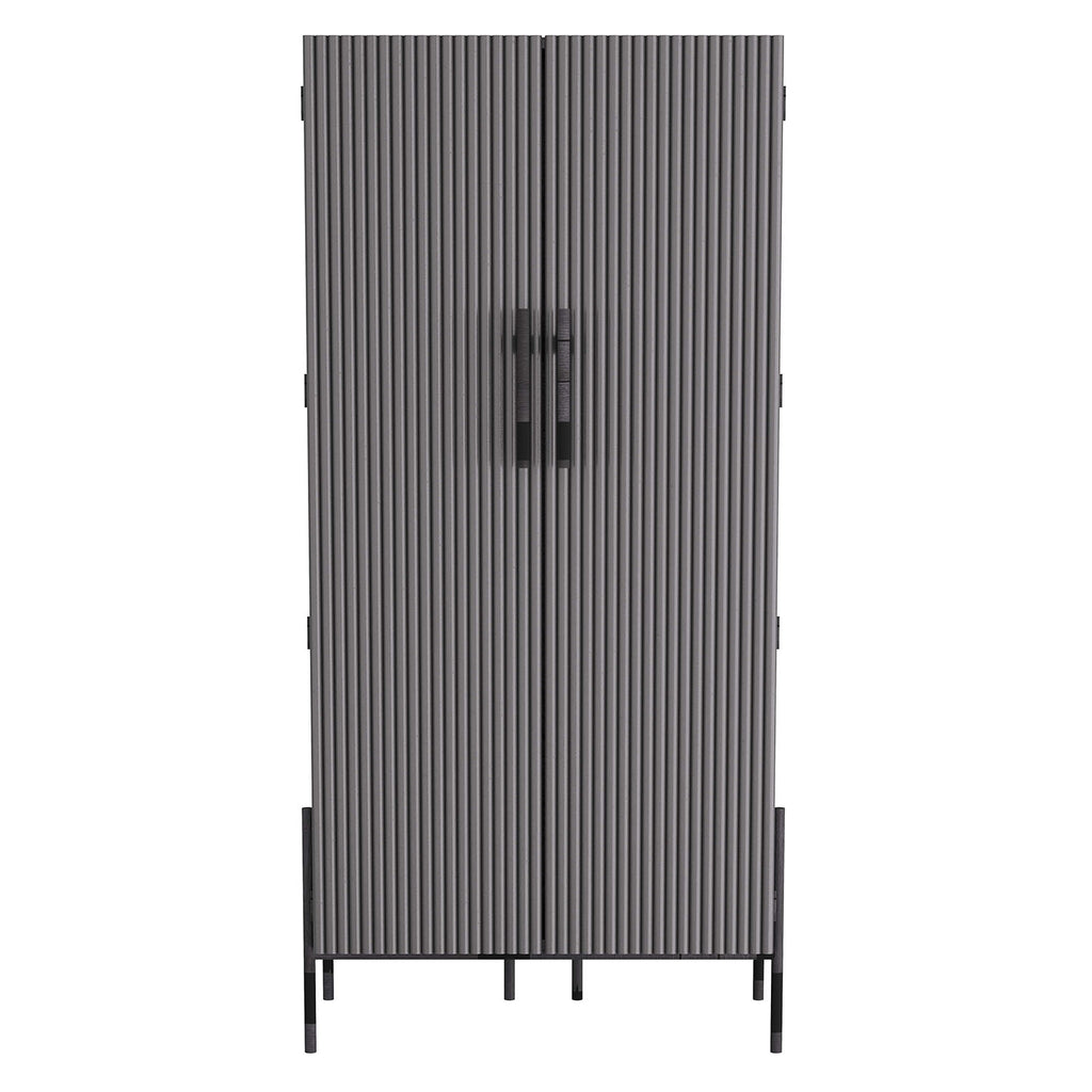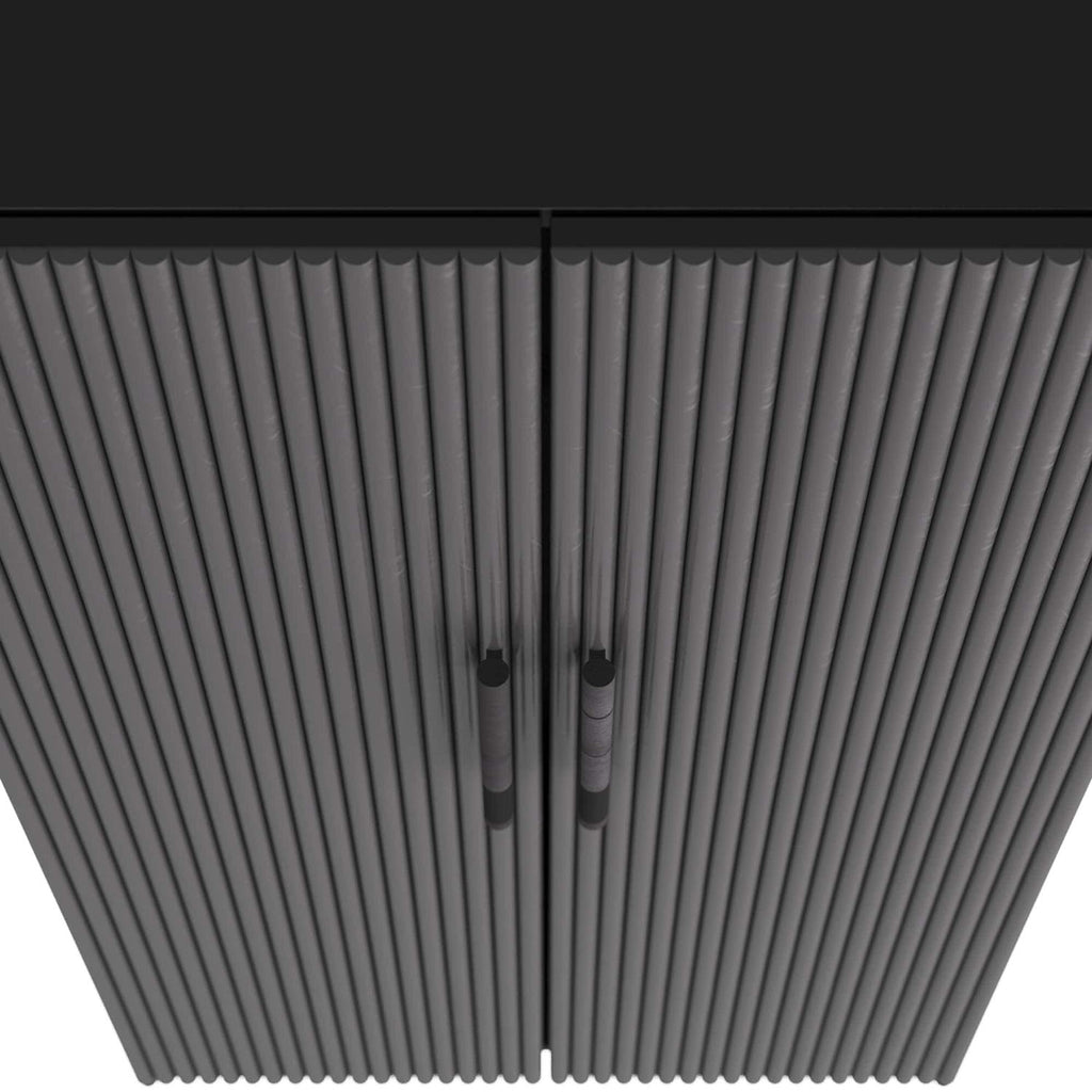 With old hollywood inspiration, the Arteriors Thurman cabinet is fashioned with a channeled, graphite leather exterior, imparting a sophisticated masculinity. The luxe cabinet is framed in ebony oak and features bronzed stainless steel tubular pulls and matching legs that extend vertically, becoming a decorative element. The piece is fitted with adjustable shelves in ebony oak. Finish will vary.