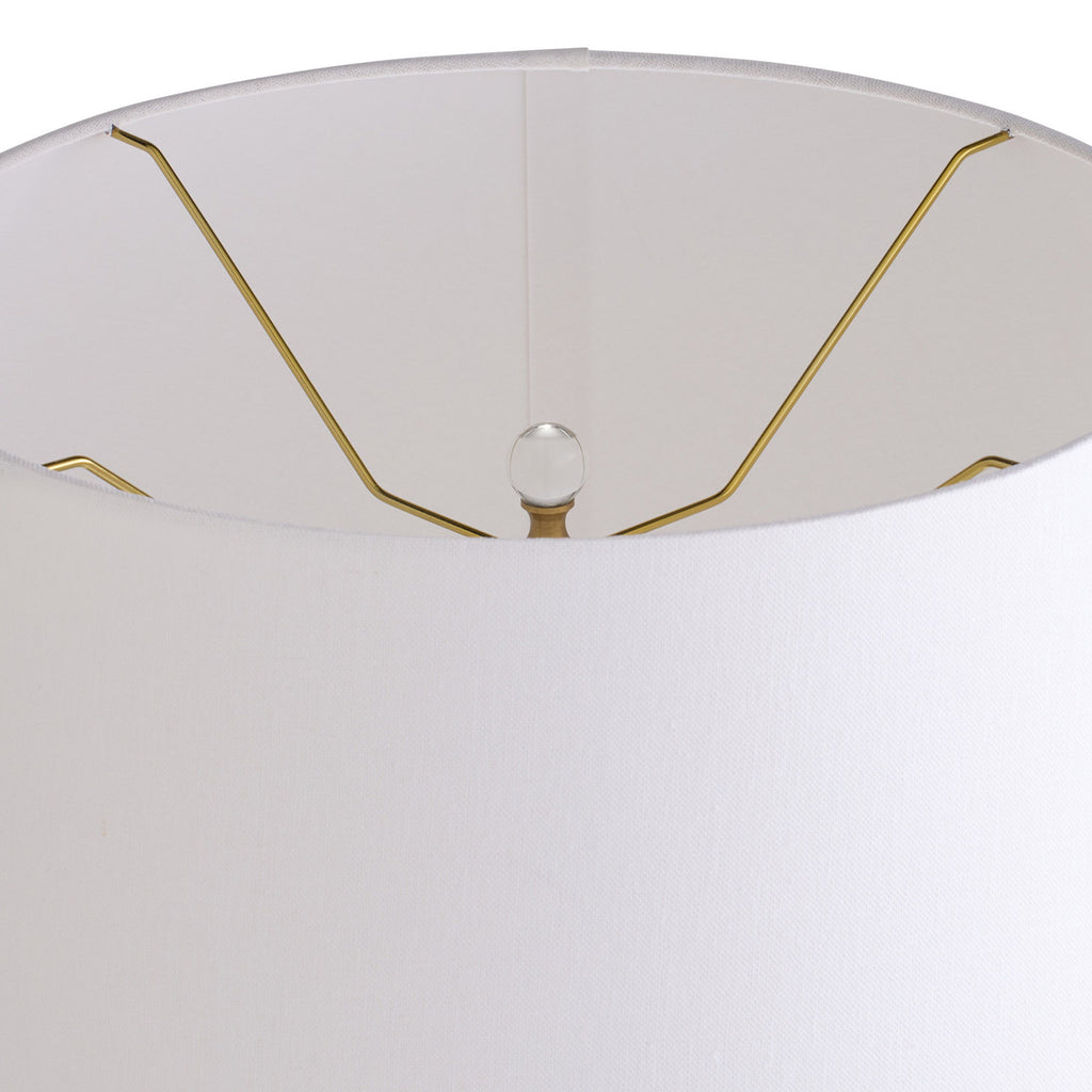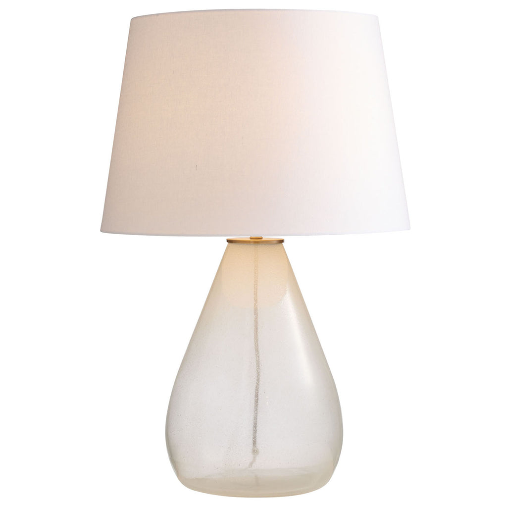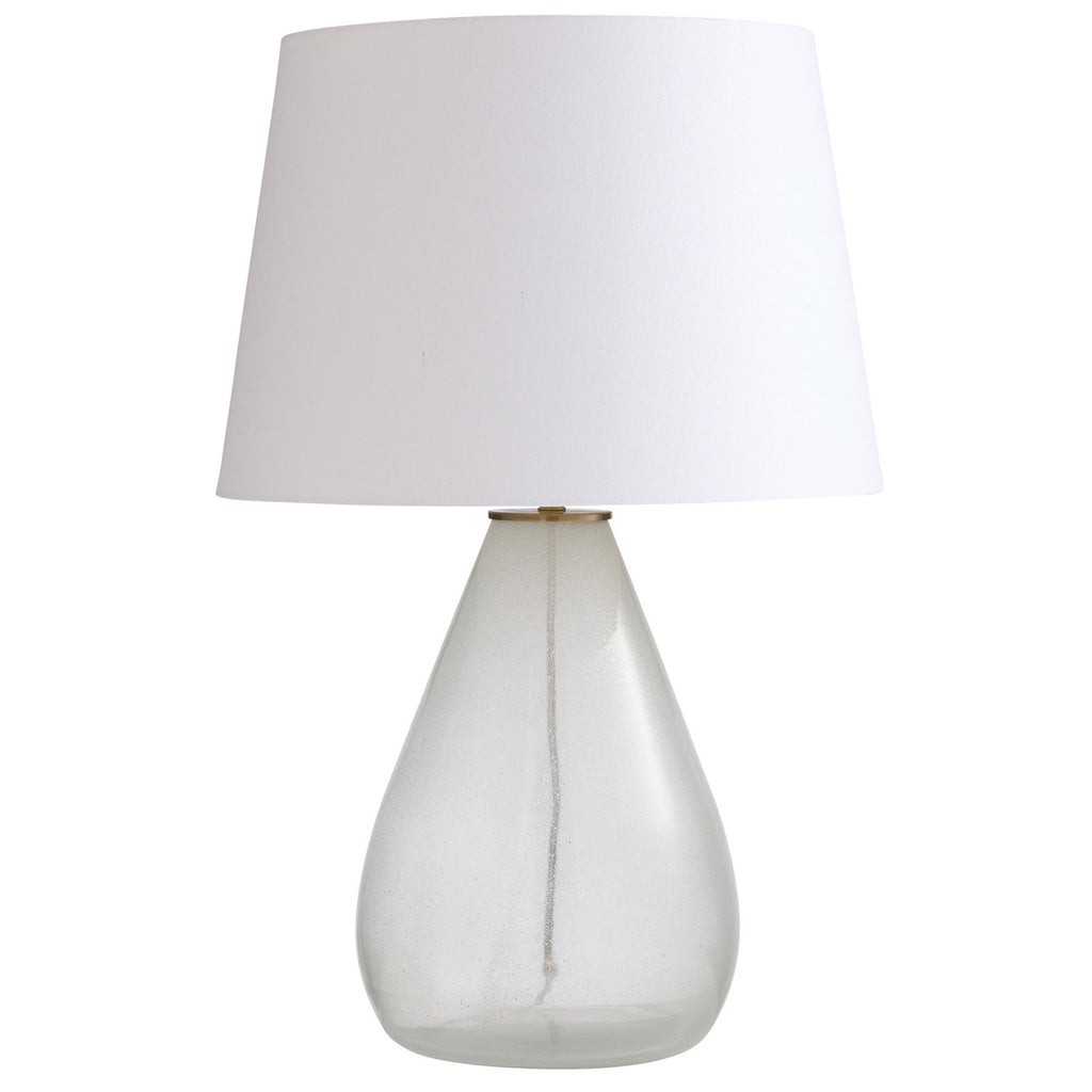 A minimal mouth-blown seedy glass lamp in clear finish, topped by a white linen shade, antique brass hardware, and clear glass ball finial—clean, luminous, and elegant. Finish will vary.