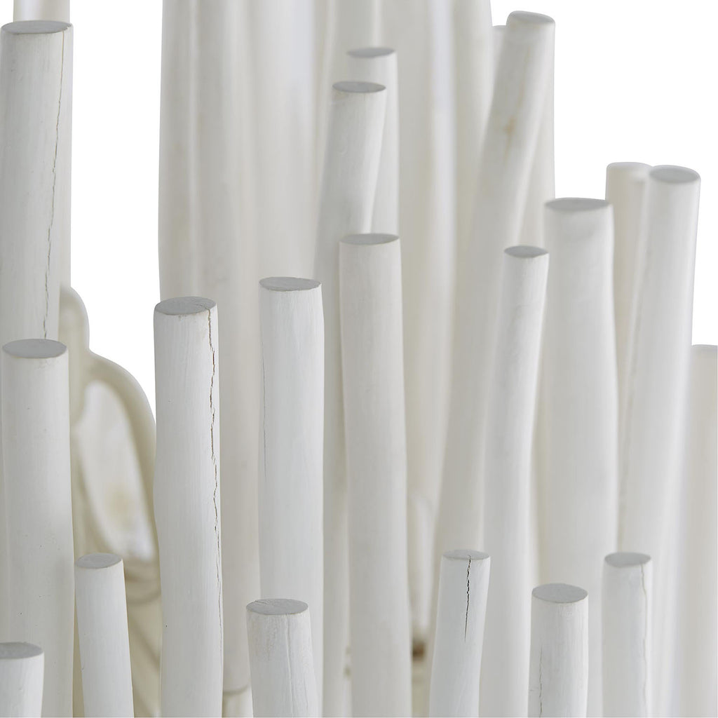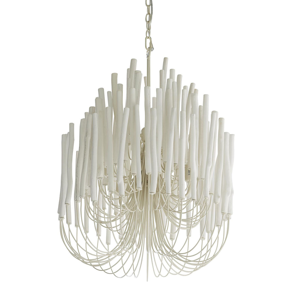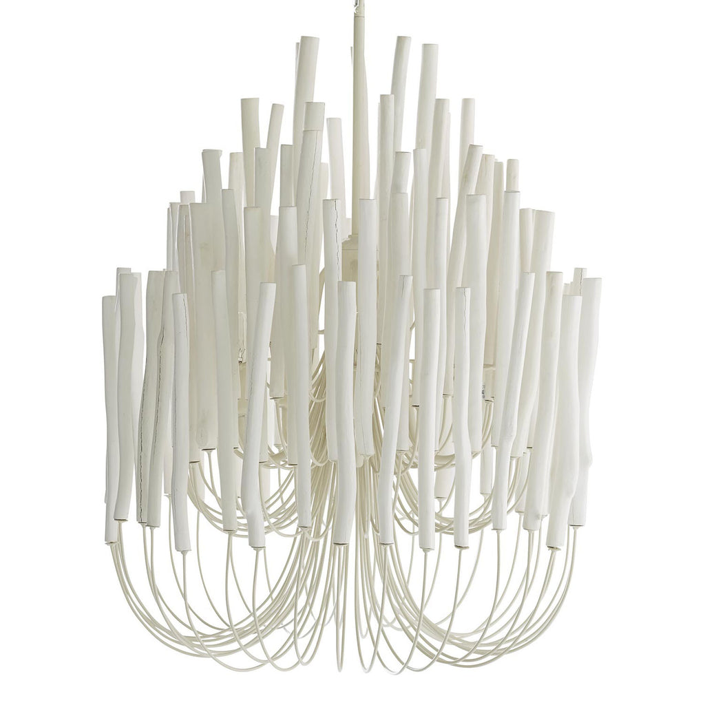 Arteriors Home lighting embodies the perfect balance of form and function, creating an ambiance that is both captivating and inviting. With an emphasis on superior craftsmanship, Arteriors ensures that their chandeliers not only illuminate the room but also make a statement. Arteriors chandelier with several tiers of wooden sticks on curved iron arms all in a whitewash finish. The wooden dowels are placed atop pliable arms. When switched on the light glows from within and transforms the space into something magical. During installation please ensure that all bulbs are not touching any of the wooden dowels. If they are gently press the arm away from the bulb about an inch to allow heat to properly disperse.