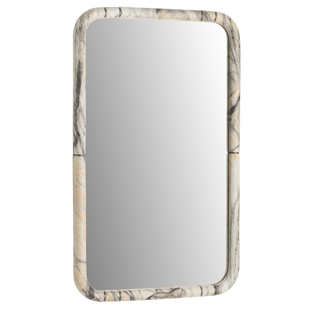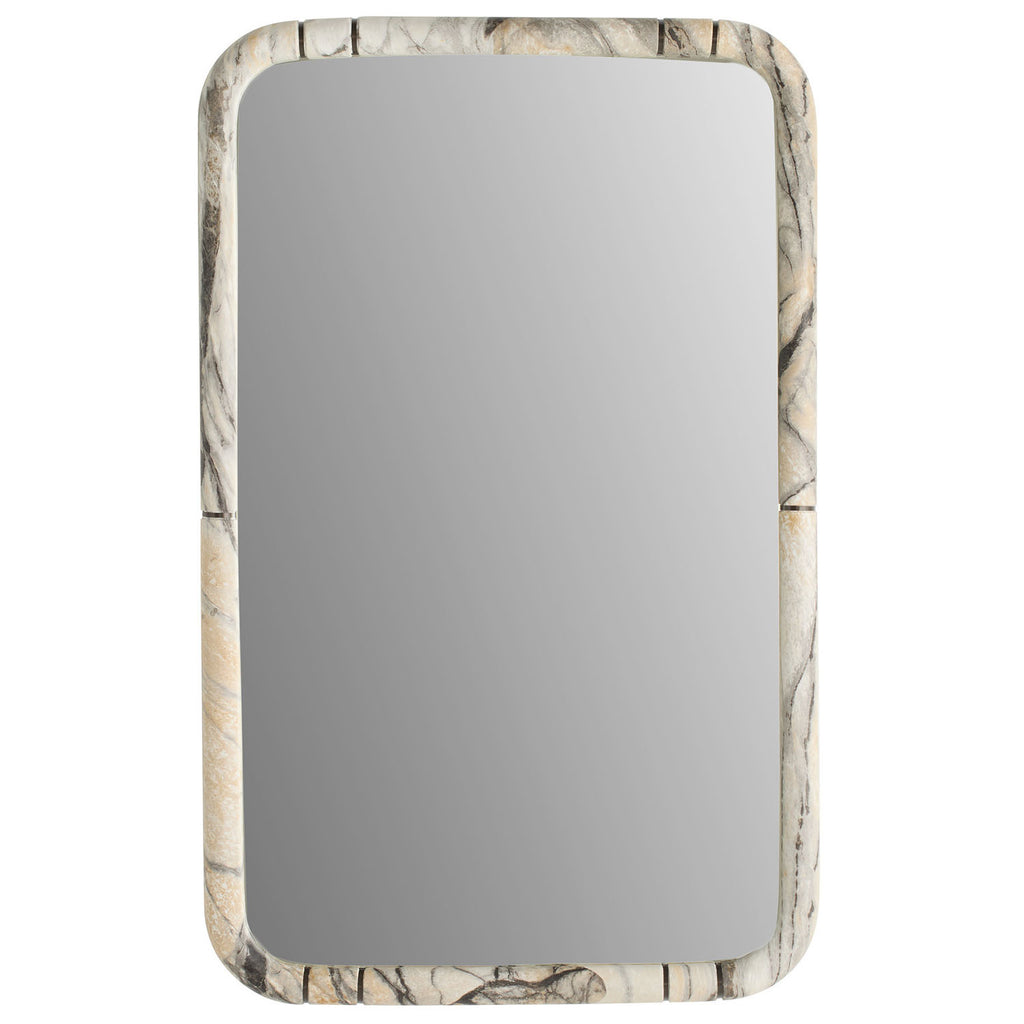 Reminiscent of carved marble, a frame of gray flower resin is adorned with accents of bronze-plated iron. Paired down and polished, this rectangular style will add classical appeal to a powder room or foyer and can be displayed in multiples for visual impact. Designed to be hung vertically or horizontally, it is secured with a back cleat for display. Hanging hardware included.