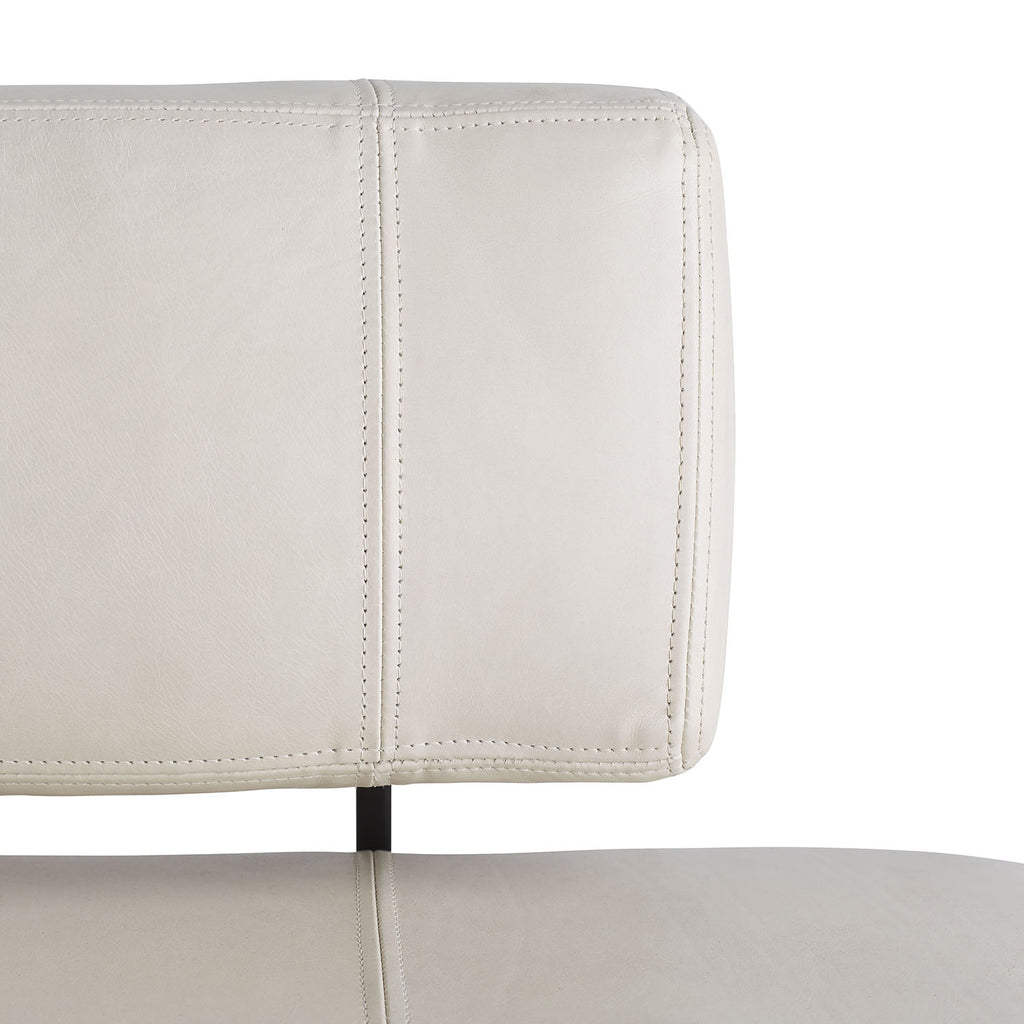 An elegantly upholstered bench in ivory leather, supported by steel legs and featuring a floating back—an architectural statement with versatility. Finish will vary.