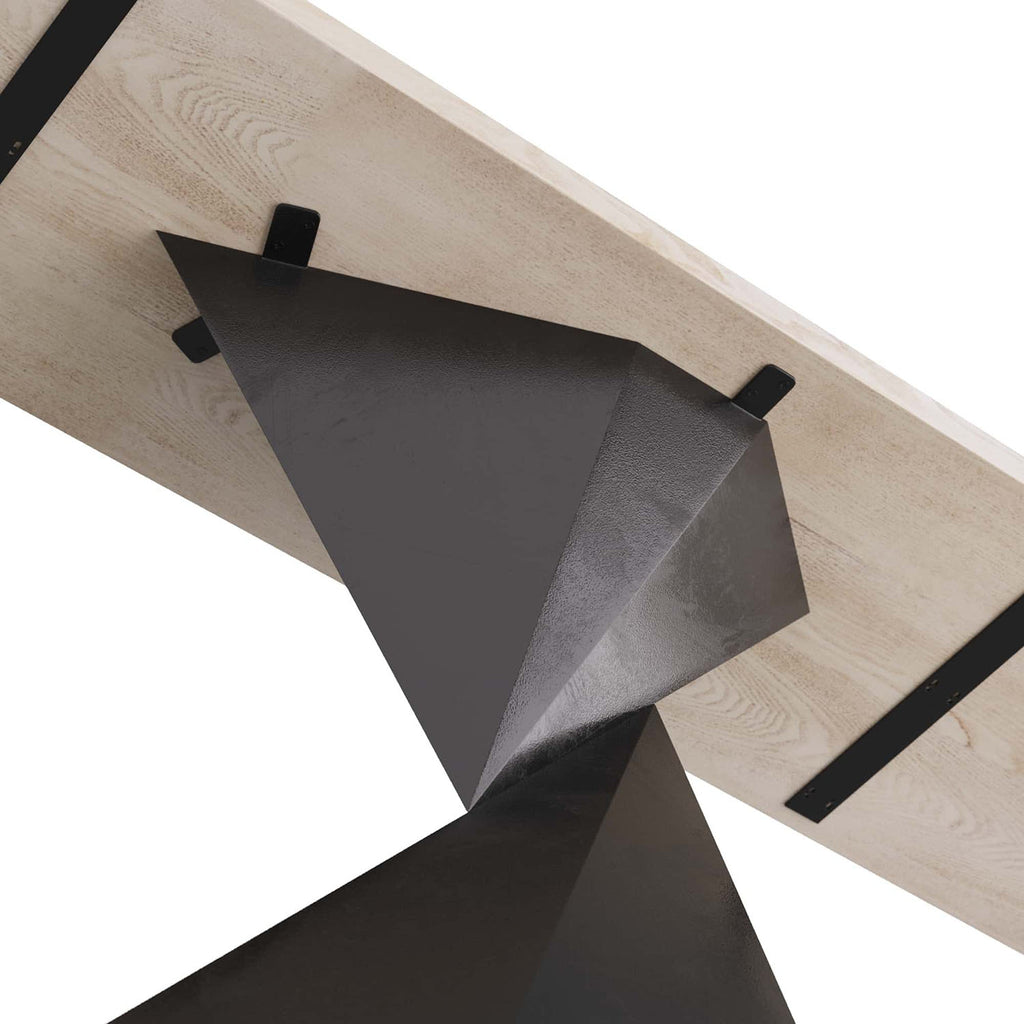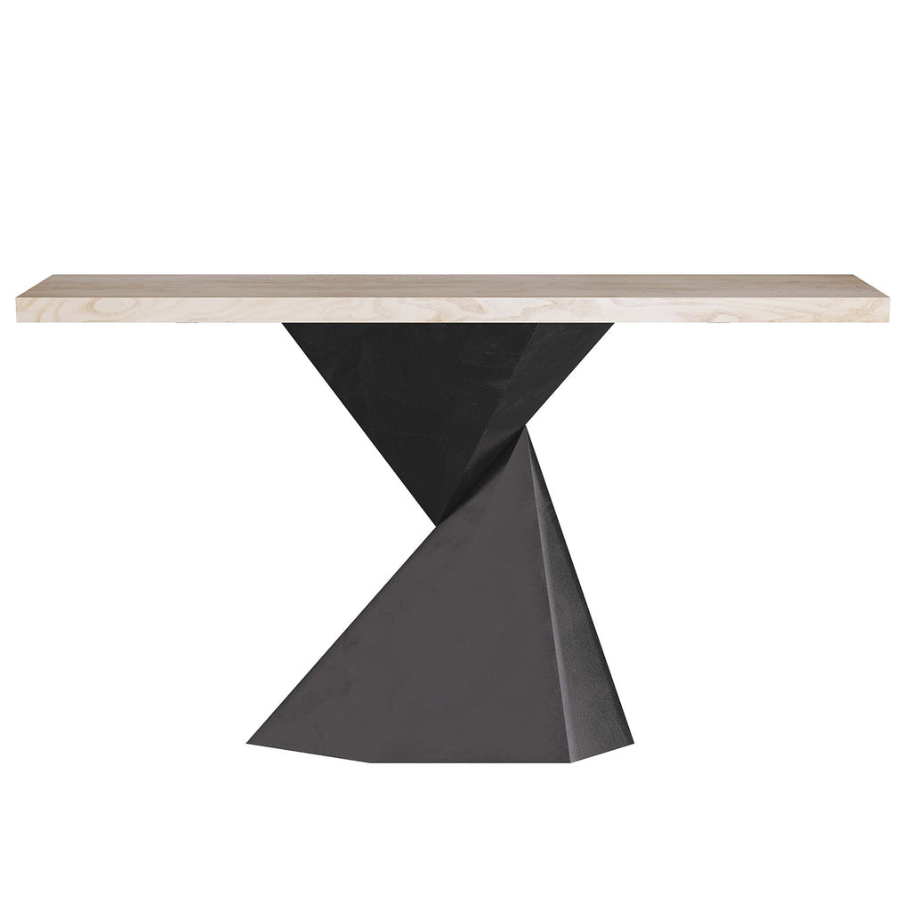 Sleek and modern, our Arteriors Valder console was inspired by the tight paper folds in origami and reimagined as a twisted, faceted, blackened-bronze iron pedestal base with a high-contrast smoke oak top. Finish will vary.