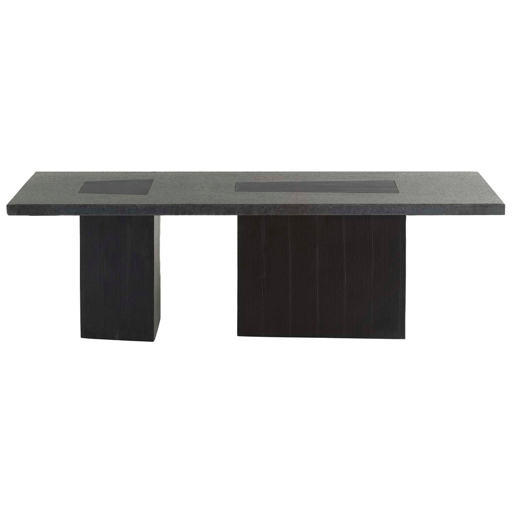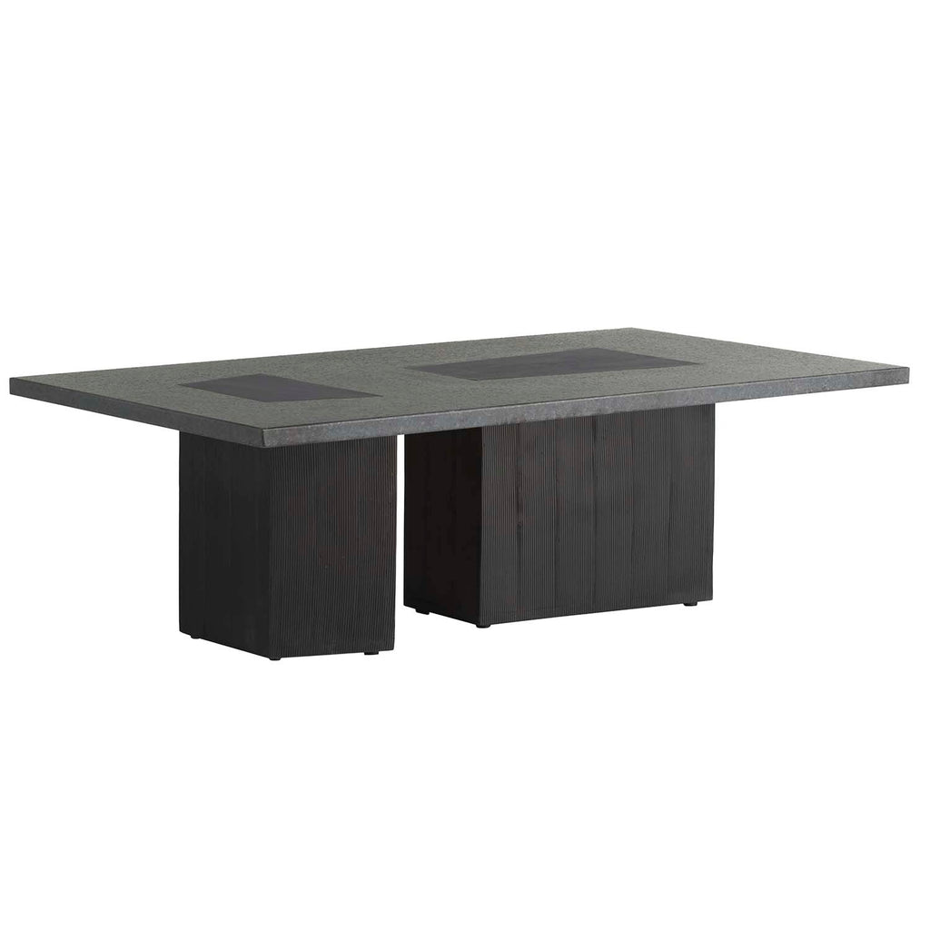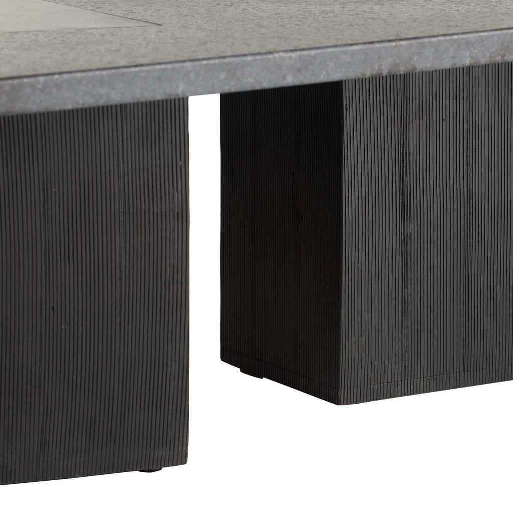 Our Arteriors Vance cocktail table is created in elemental, planer forms, making it versatile enough for any interior space. Trapezoidal pedestals in wire-brushed ebony mango wood create a base for a leathered charcoal marble top, giving the effect that the wood is piercing through the marble surface. Finish will vary.