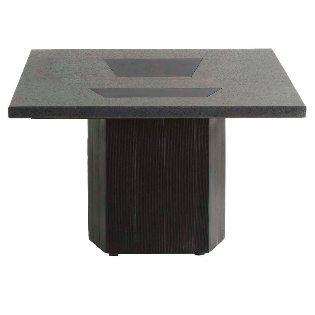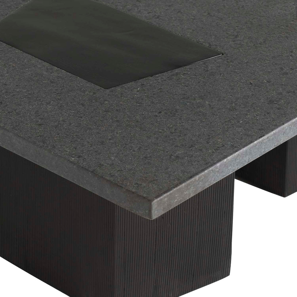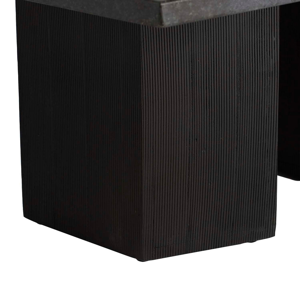 Our Arteriors Vance cocktail table is created in elemental, planer forms, making it versatile enough for any interior space. Trapezoidal pedestals in wire-brushed ebony mango wood create a base for a leathered charcoal marble top, giving the effect that the wood is piercing through the marble surface. Finish will vary.