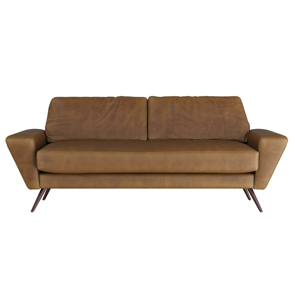 With stylized angles, our Arteriors Vidara sofa nods to atomic design, while remaining fresh and modern. The sofa is created in soft butterscotch leather, with single-cushion seat and an angled back with two loose cushions. The sleek seat is finished with tapered legs in dark walnut. Finish will vary.