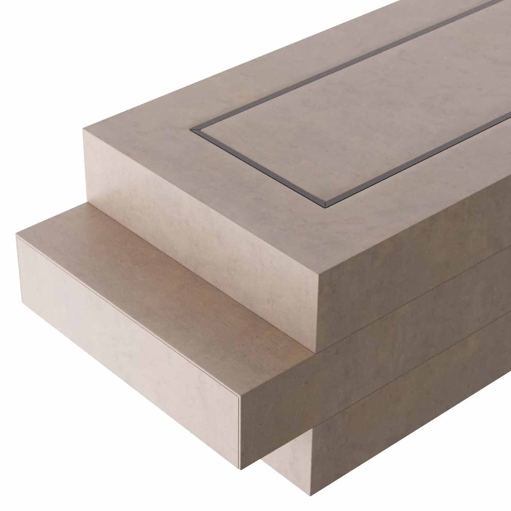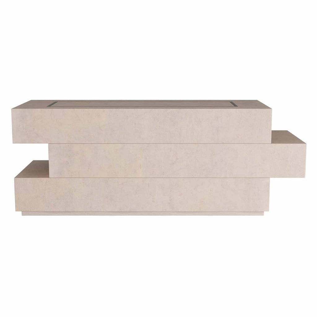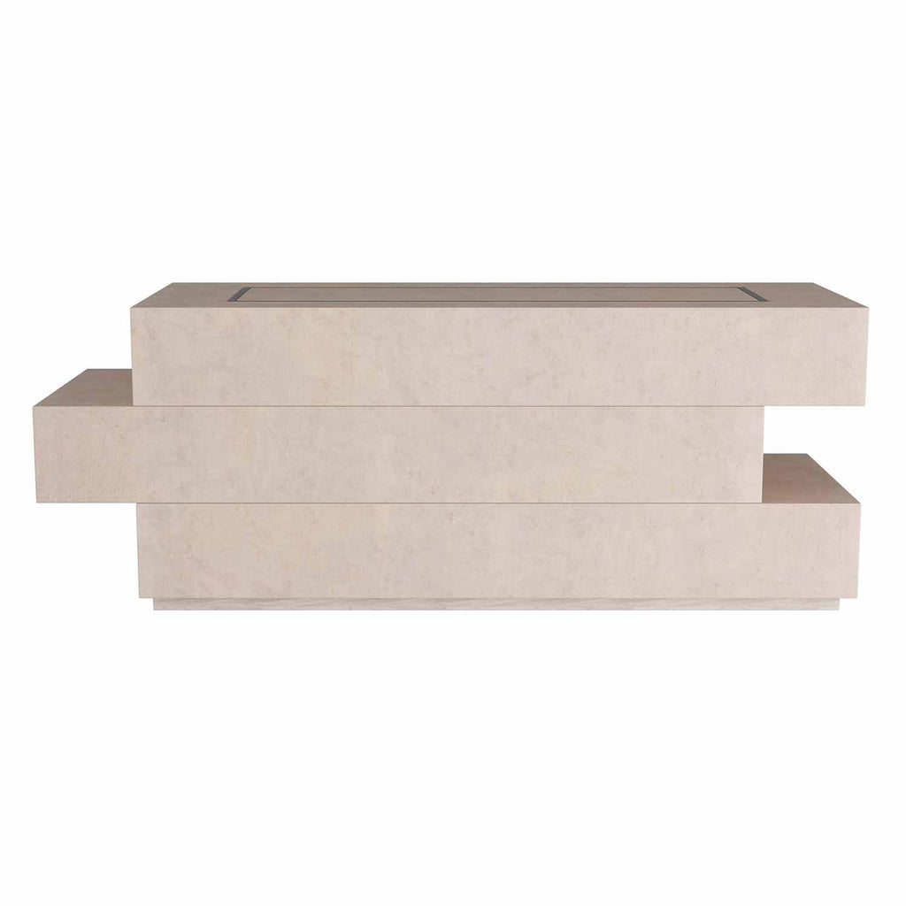 Inspired by vintage lacquered tables, our low-profile Arteriors Wilkinson cocktail table imparts a ’70s vibe. The piece, with a stacked, offset composition, is crafted in greige maple veneer, detailed with a bronze-iron surface inlay. The savvy design incorporates three hidden drawers for added function. Finish will vary.