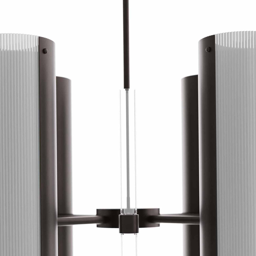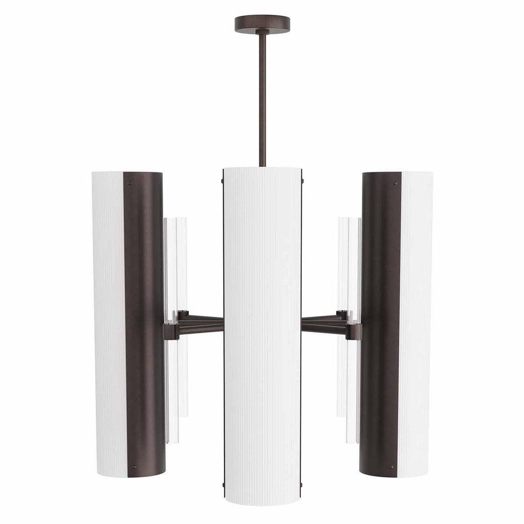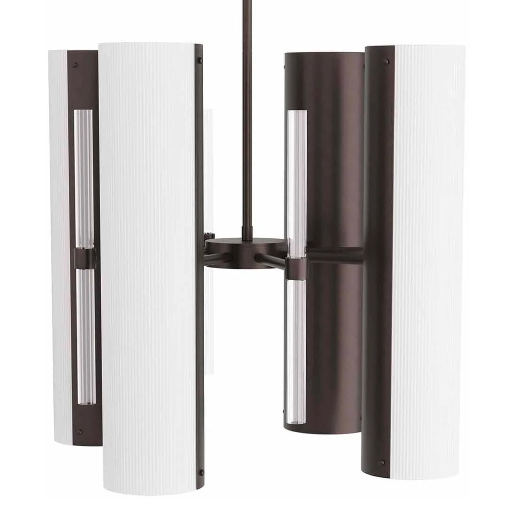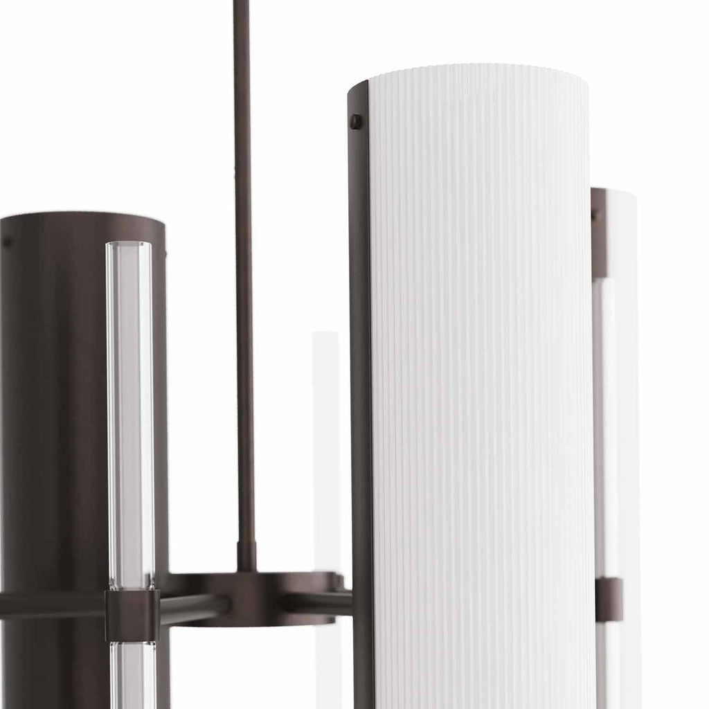 Arteriors Home lighting embodies the perfect balance of form and function, creating an ambiance that is both captivating and inviting. With an emphasis on superior craftsmanship, Arteriors ensures that their chandeliers not only illuminate the room but also make a statement. Our Arteriors Winslow chandelier exudes penthouse sophistication, designed in a framework of english bronze steel. A linear arrangement of ribbed, white acrylic and english bronze cylinder shades that extend off four arms, divided by suspended clear crystal tubes. The chic chandelier is suspended from a pipe that is connected to a disc canopy. Damp-rated, although limited covered outdoor conditions may affect finish.
