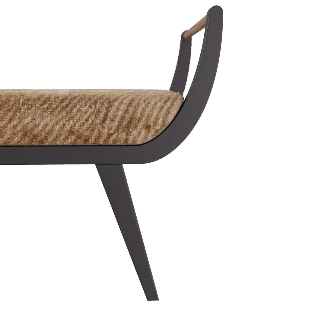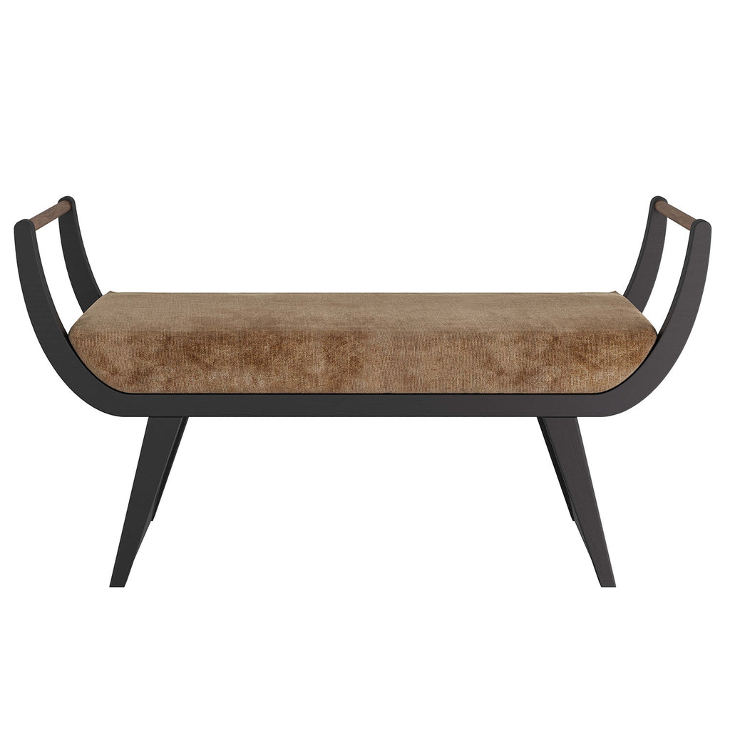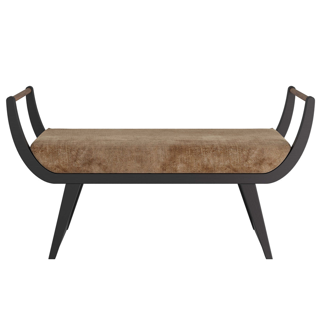 Elegantly appointed in a lustrous harvest velvet, our midcentury-influenced Arteriors Winston bench dresses up any space. Modern and timeless, the seat is designed with sled-legs in ebonized acacia wood, and features brass-clad arm detailing. Finish will vary.