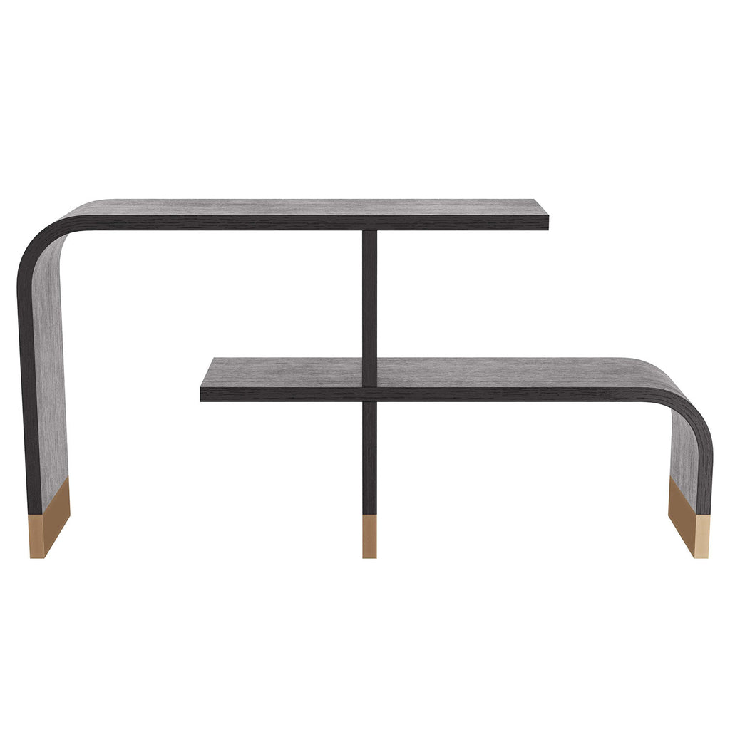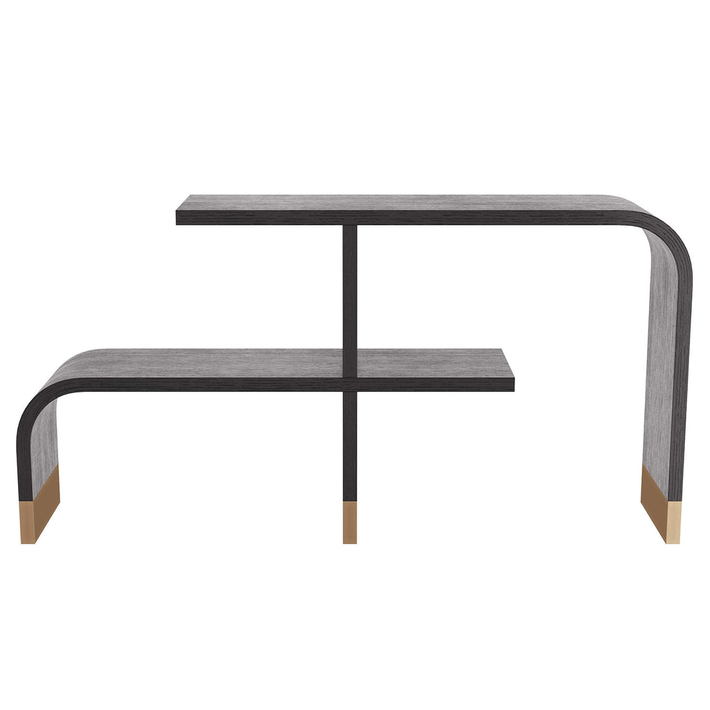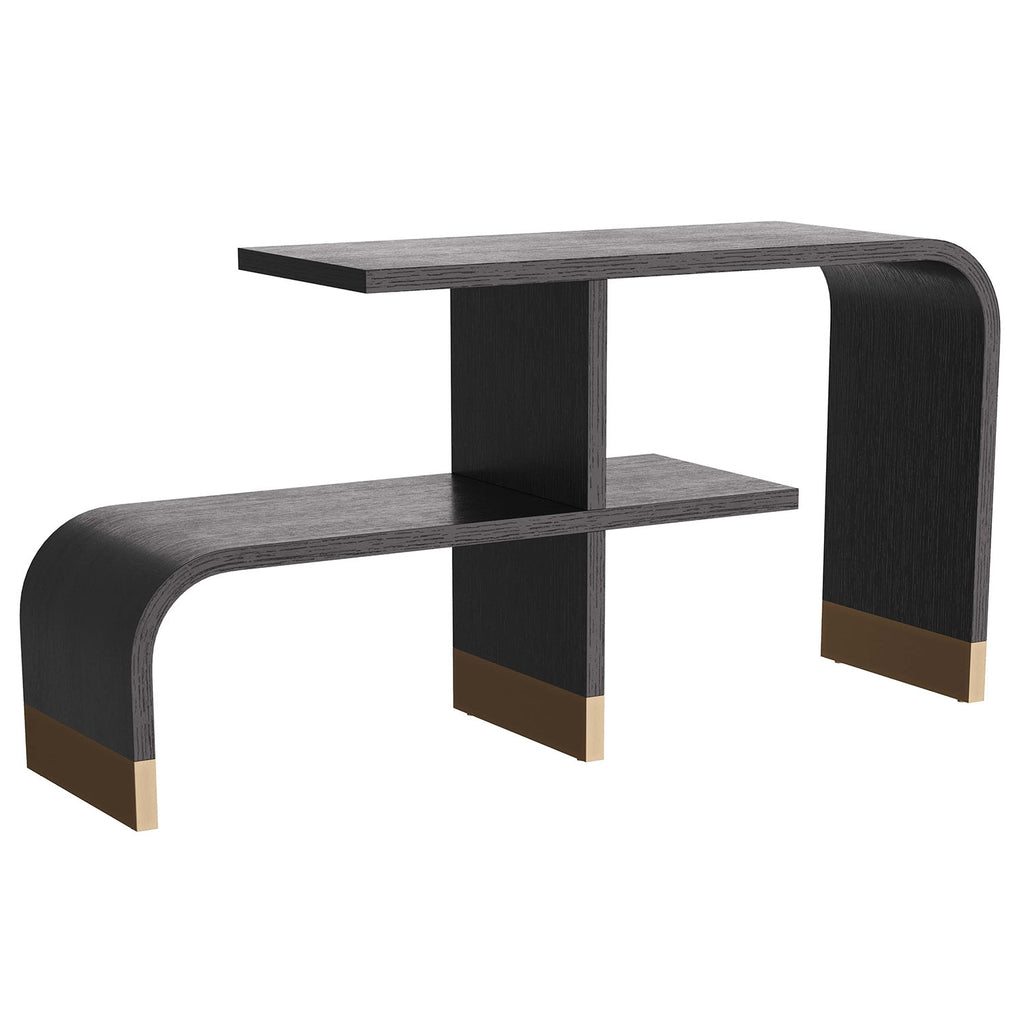Inspired by art deco shapes, the sinuous Arteriors Wyngate etagere makes a graceful and dramatic display piece. Two ebony oak veneer shelves with waterfall curves create staggered heights. Thick bands of antique brass wrap each leg, providing contrasting detail. Finish will vary.