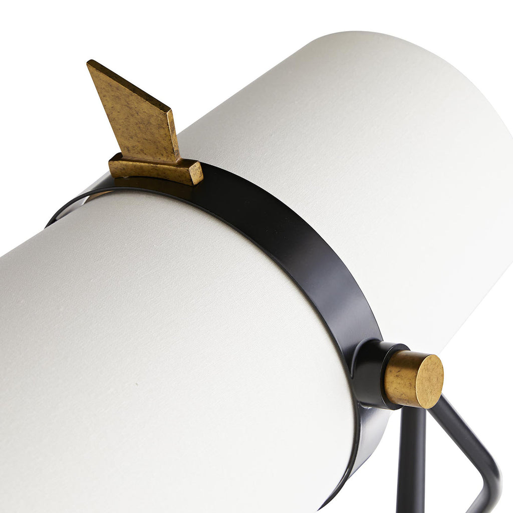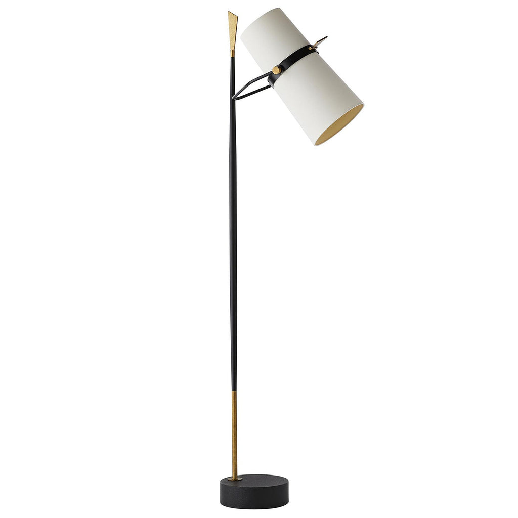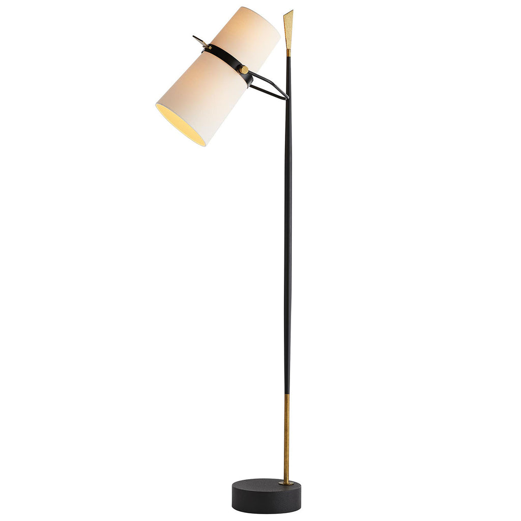 A modern floor lamp with a slender black iron rod, vintage brass finial, and a double linen shade over off-white lining; full-range dimmer via foot switch. Finish will vary.