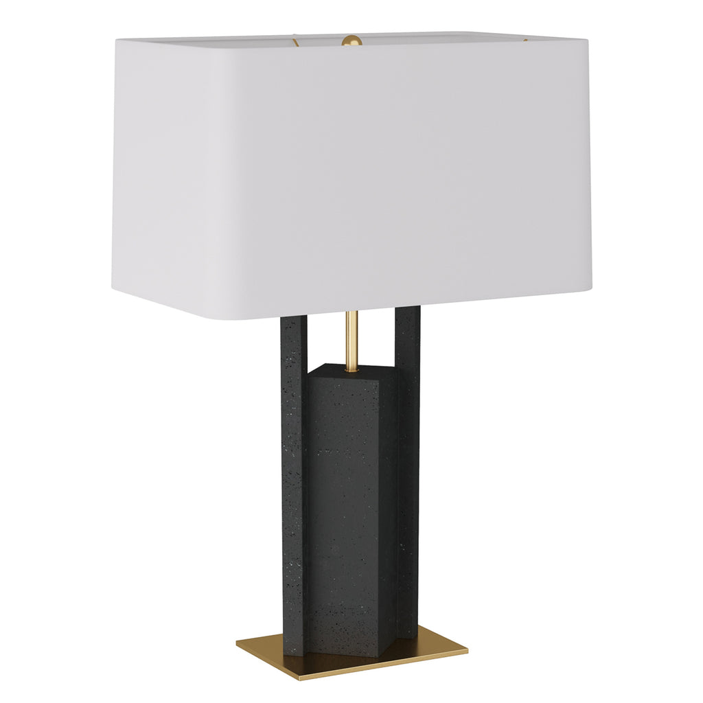A modern geometric form of charcoal ricestone composite adds edge to the traditional table lamp. Accented with an antique brass support and base for contrast, this geometric style is a masculine, modernist accent for any room. Topped with a rectangular drum shade in off-white microfiber lined in cotton. Taupe cloth-wrapped cord and three-way rotary switch. Finish will vary.
