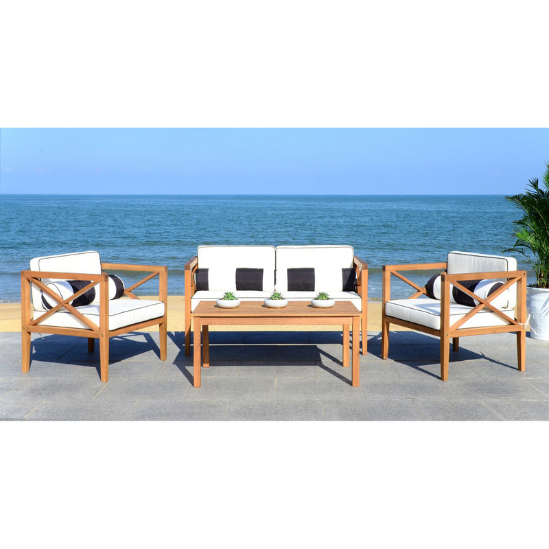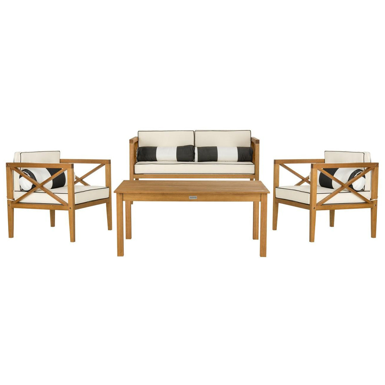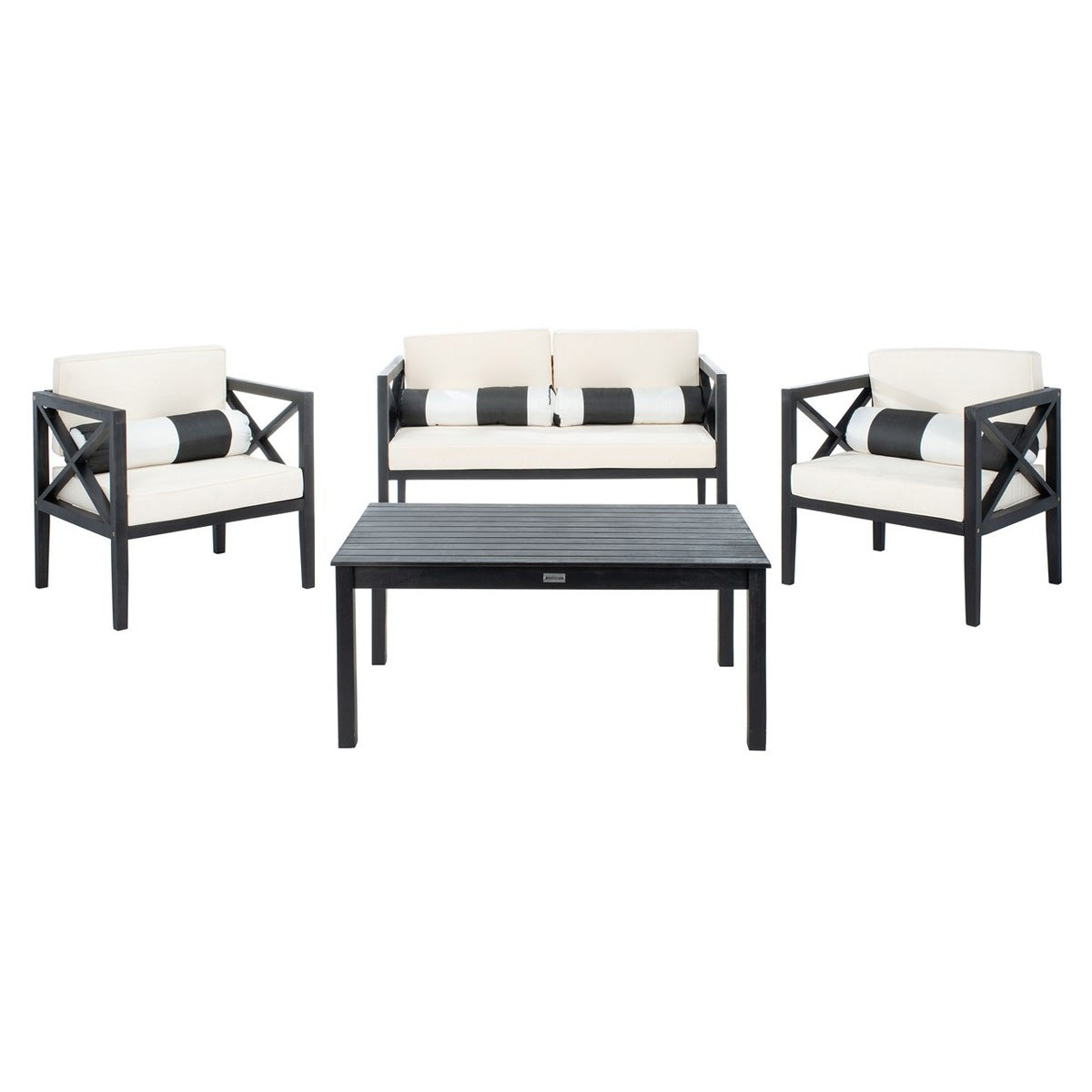 Update any outdoor living space with this contemporary 4-piece outdoor set. Crafted in a Black or Natural hue, designers love its modern cross-back style. Ideal for all outdoor entertaining, its plush upholstery with accent pillows makes it a great investment. Sold as set of 4.