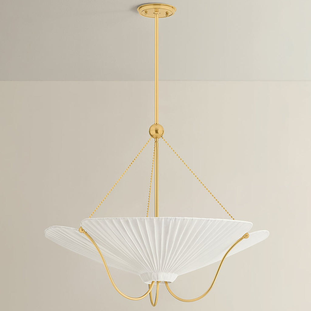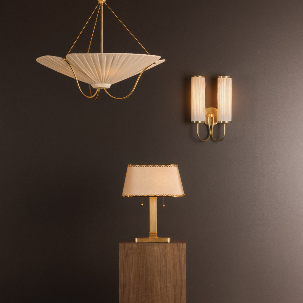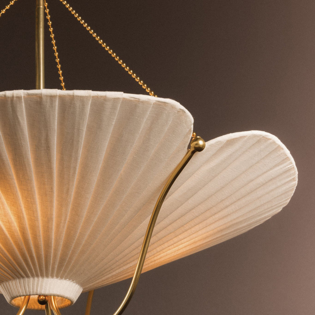 Drawing inspiration from the organic elegance of the Art Nouveau period, Hudson Valley Lighting Gerhard reinterprets floral motifs with architectural clarity. Gracefully arched metalwork in a warm Aged Brass finish supports sheer ivory linen shades, crafted with a unique pleating technique that adds volume and dimension. Together, these elements form abstracted botanical shapes that feel both refined and expressive. Available as a semi flush mount and a 3 or 9-light pendant, this decorative up light serves as a captivating, sculptural focal point.