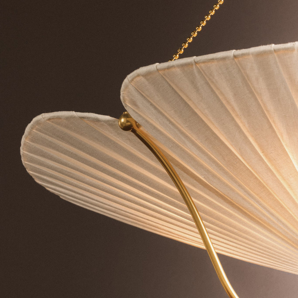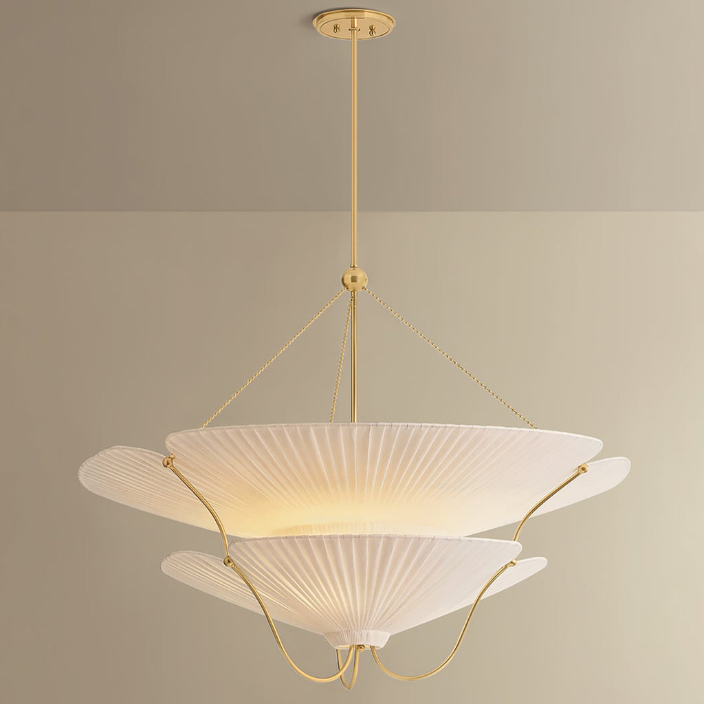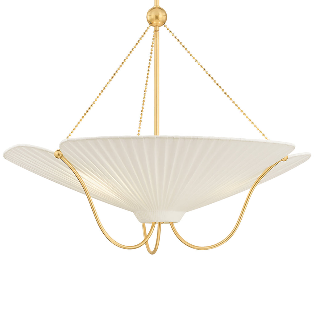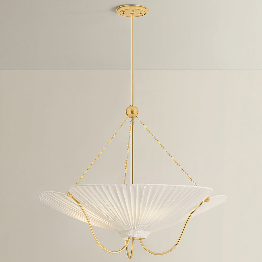 Drawing inspiration from the organic elegance of the Art Nouveau period, Hudson Valley Lighting Gerhard reinterprets floral motifs with architectural clarity. Gracefully arched metalwork in a warm Aged Brass finish supports sheer ivory linen shades, crafted with a unique pleating technique that adds volume and dimension. Together, these elements form abstracted botanical shapes that feel both refined and expressive. Available as a semi flush mount and a 3 or 9-light pendant, this decorative up light serves as a captivating, sculptural focal point.