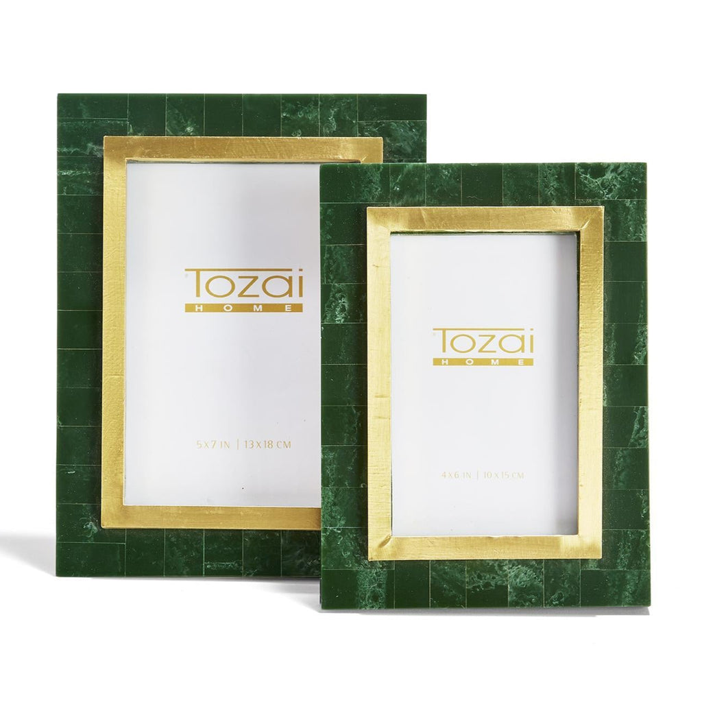 These beautiful frames are created with layered green resin giving it additional depth. Finished with an inner rim of gold these elegant frames are the perfect way to highlight your photos.