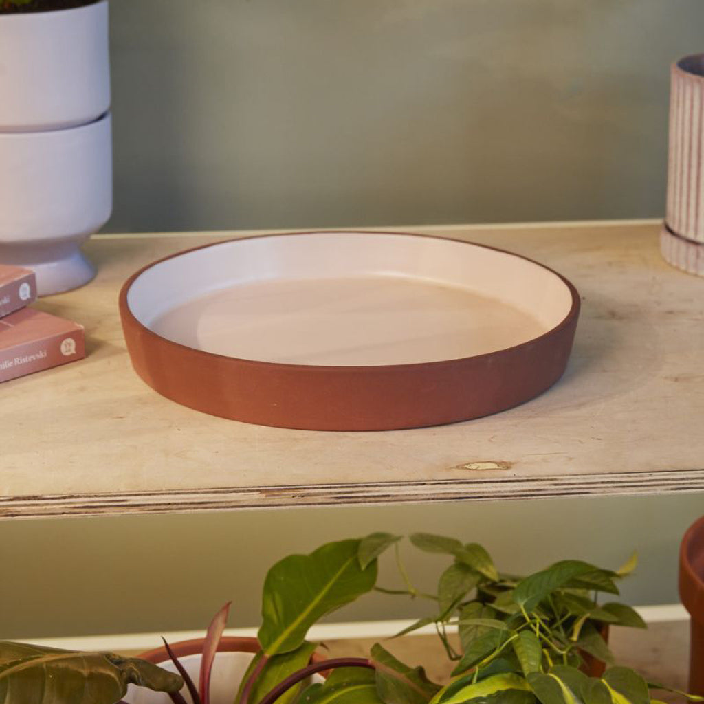 Elevate your plant's drainage saucer with the fresh natural color combo & versatility of the Avila Tray, made from terracotta with a light pink smooth glazed interior. Its wide size is ideal for a large pot, a grouping of small plants, as a pebble tray to keep moisture-loving plants happy, or for merchandising products together in a retail space.