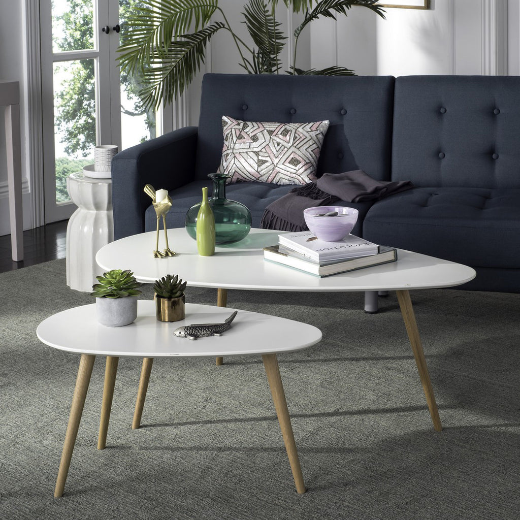 Inspired by a piece in a Swiss design museum, this contemporary split coffee table is a masterpiece of organic style. The bright white surface of its two conjoined tables are paired with a warm, natural finish, creating conviviality in any interior. Sold as set of 2.