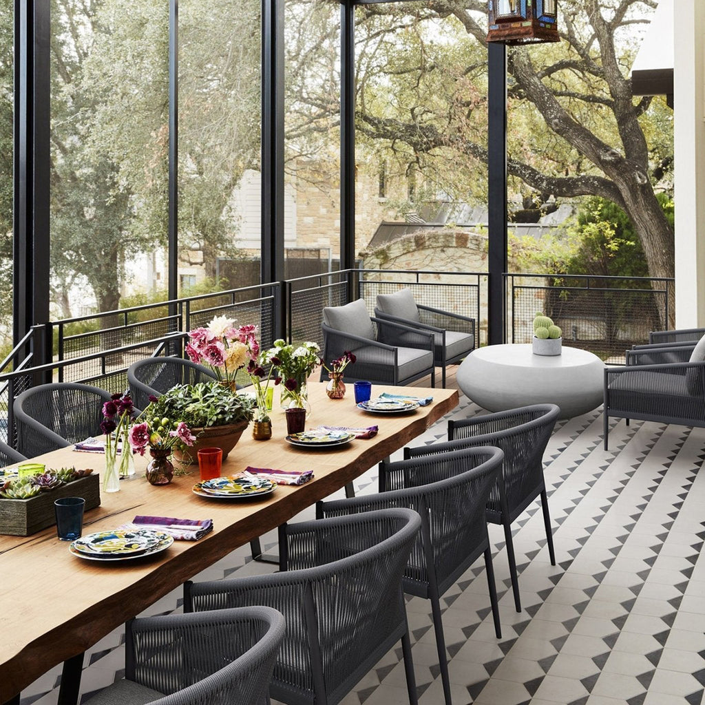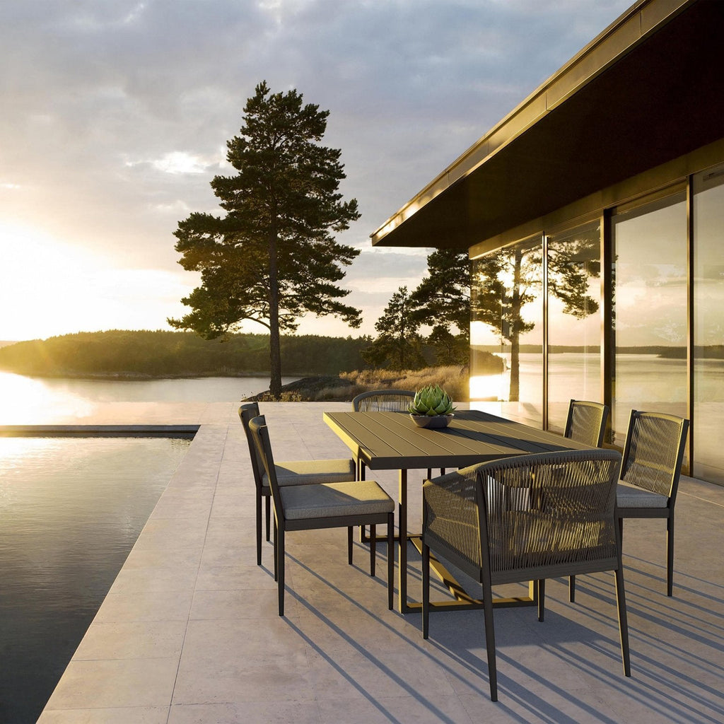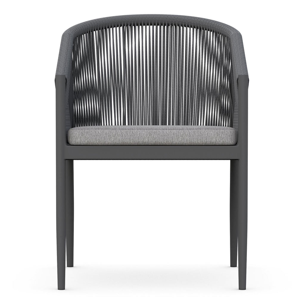The Catalina Dining Chair by Azzurro Living is a stylish and comfortable addition to any outdoor space. Its fully welded and powdercoated aluminum frame, combined with performance rope, make it a durable and long-lasting choice. The handwoven all-weather rope and tapered legs give the chair a bold and striking appearance. The high density cushions are covered in a chenille performance fabric that can withstand harsh weather conditions.