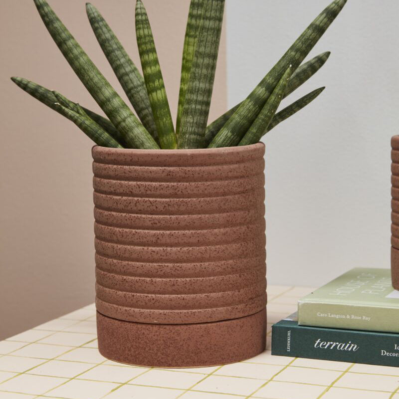 With a slightly sandy texture, horizontal ribbing, & warm terracotta color, the small cylindrical ceramic Bardo Pot with Saucer offers an organic, modern sensibility to the home. Featuring a drainage hole, this pot with dimensional stacked rings sits atop a matching saucer & seamlessly layers into any plant collection & interior design style.