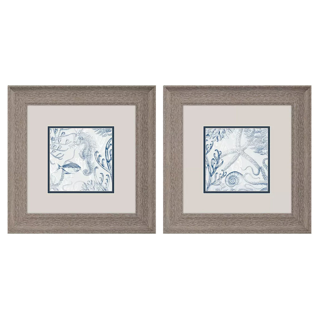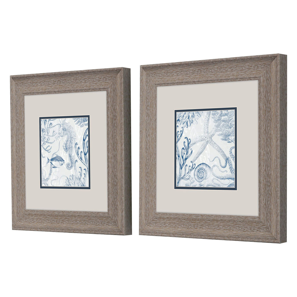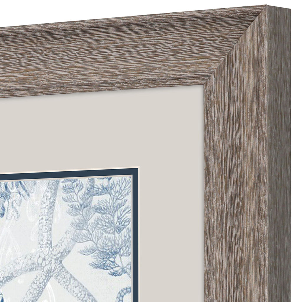 The ocean depths are alive with plant and animal life. Matted in gray and navy blue. Framed in a rustic wood-grain finish moulding.