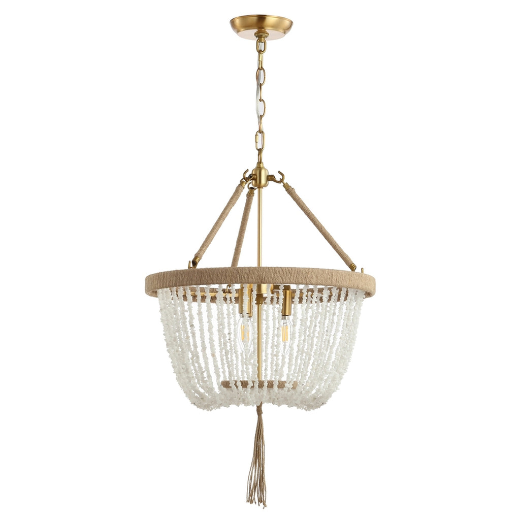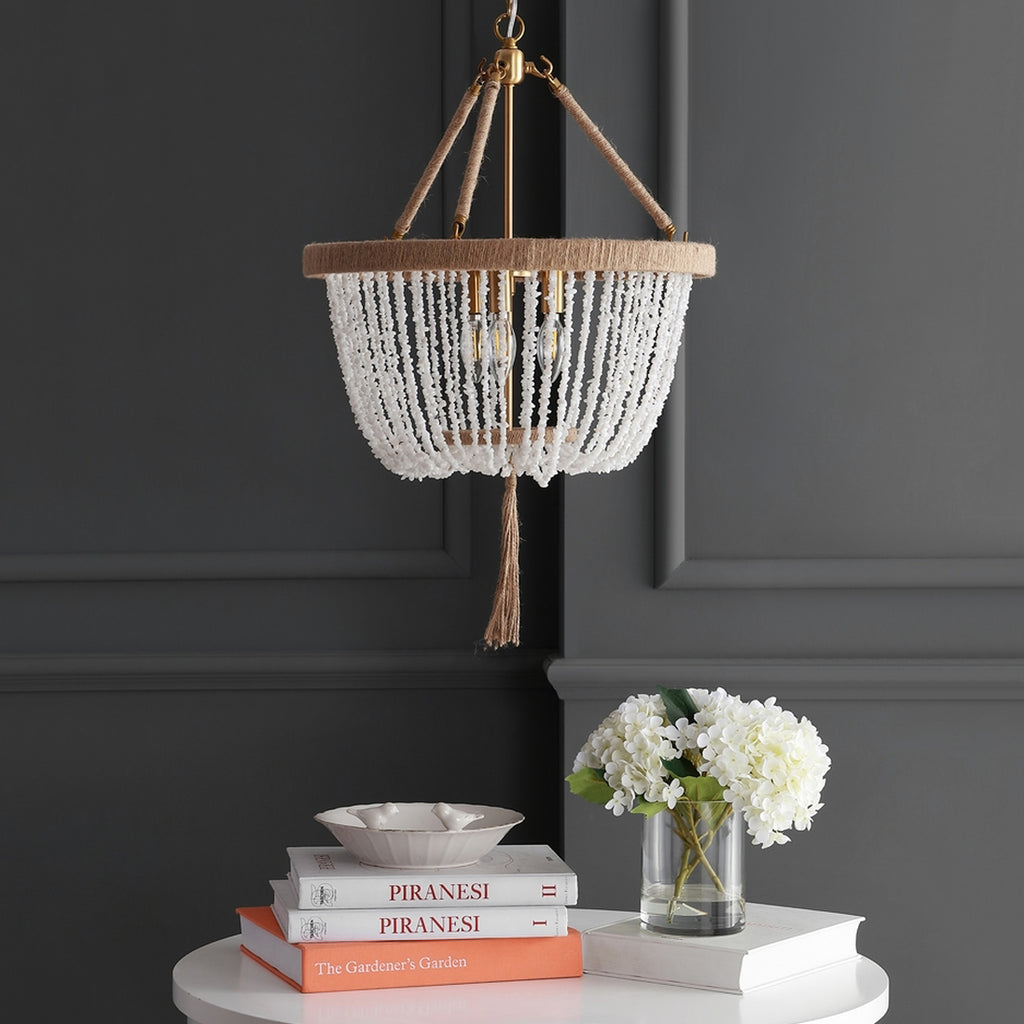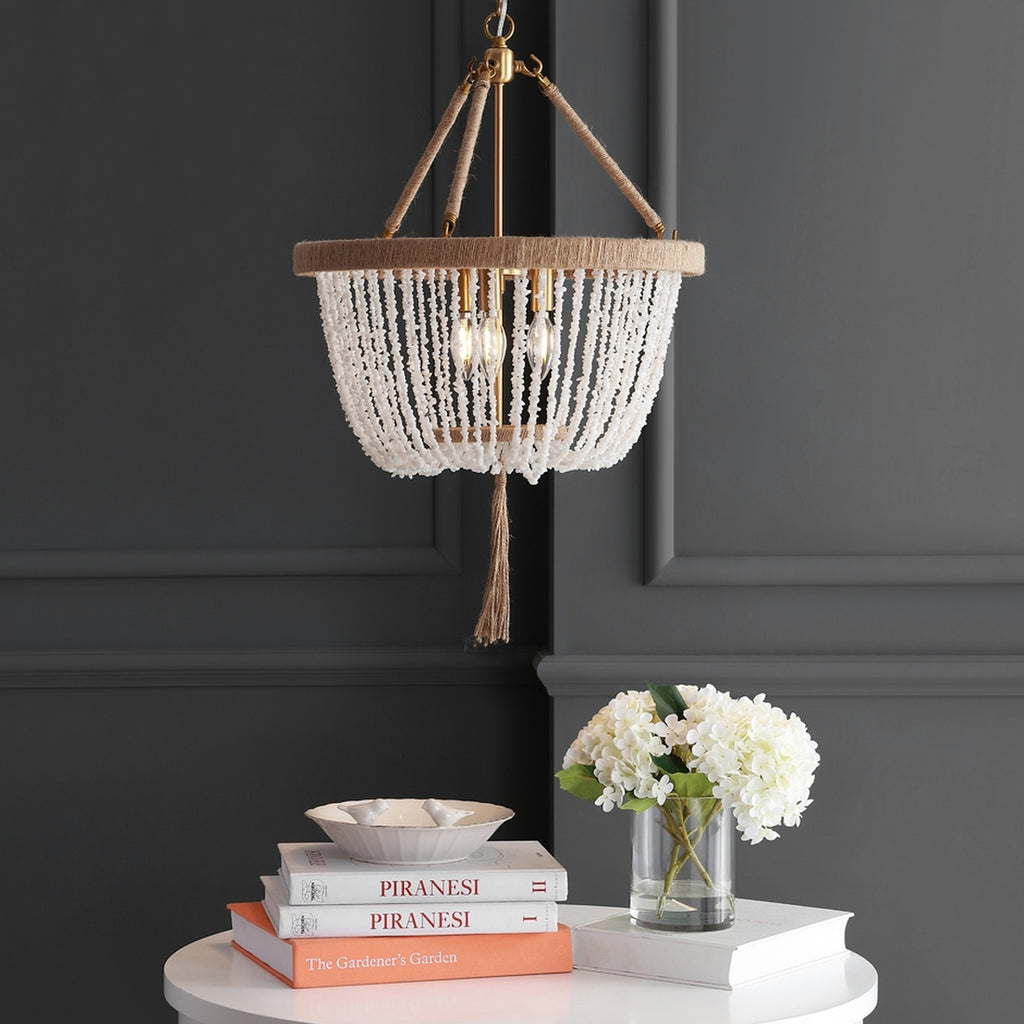 Warm and inviting, this contemporary Barrow Pendant was designed to highlight the beauty of its artisan-style craftsmanship. A romantic glow emerges from the bulbs inside its gorgeous white rope and natural bead shade. Designers love its tassel detail.