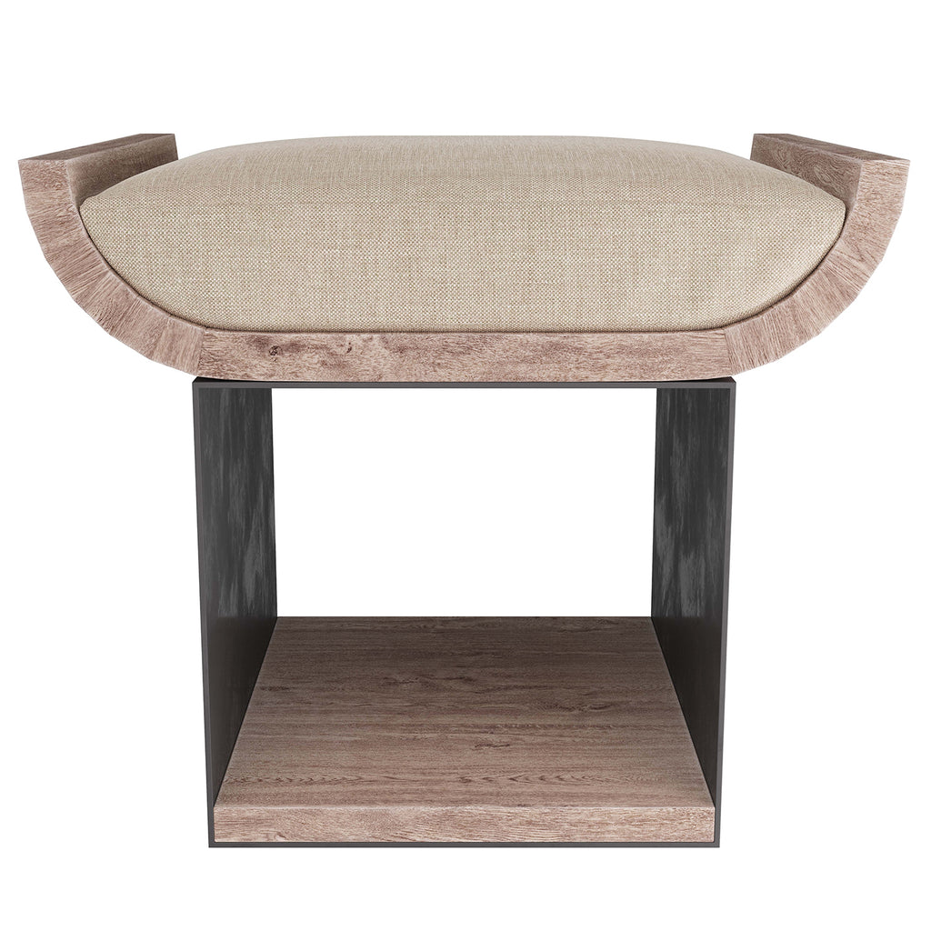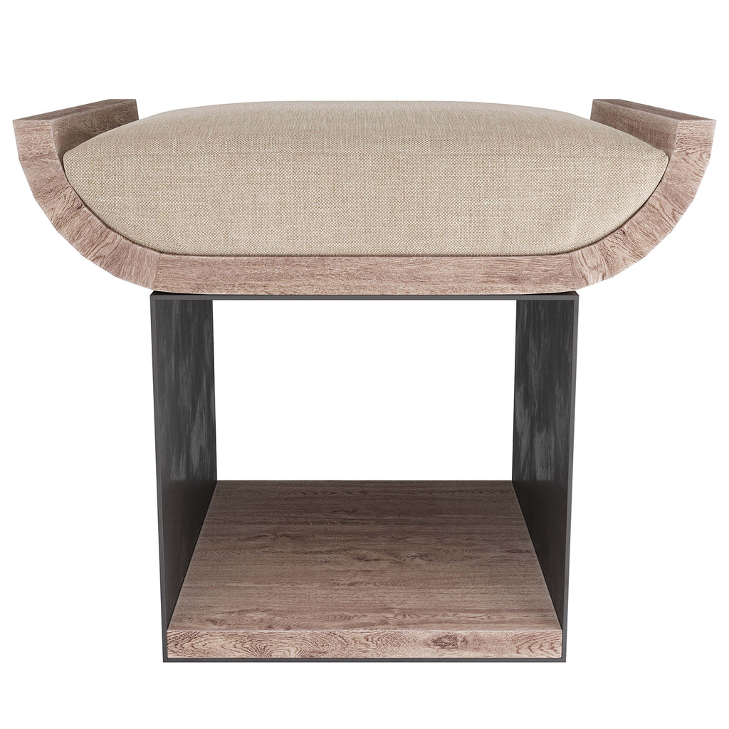Stack large art or coffee table books horizontally in the well of the whitewashed wood and gunmetal iron stool. Fitted with a natural linen cushion to use as a seat around cocktail tables, fireside, or near bookcases as a step to reach higher shelves. Finish will vary.