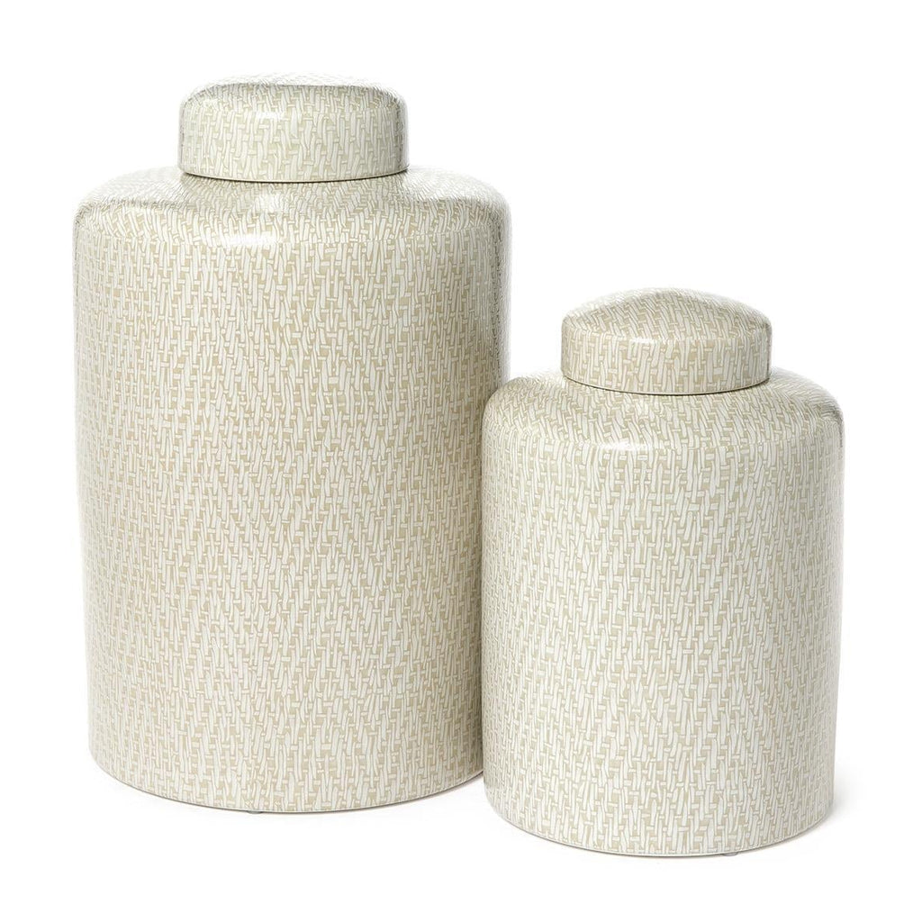 Create a charming tea station with our Twill Set of 2 Covered Tea Jars. Crafted from exquisite porcelain, these jars feature a delightful basketweave textured finish that adds a touch of elegance to any space. Perfect for storing your favorite tea blends or adding a sophisticated touch to your home decor. Handcrafted with care, these jars bring both style and functionality to your home.