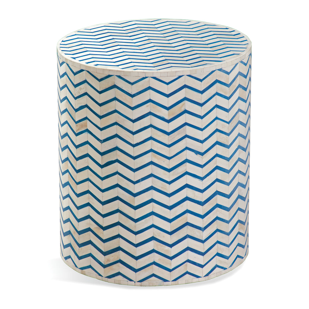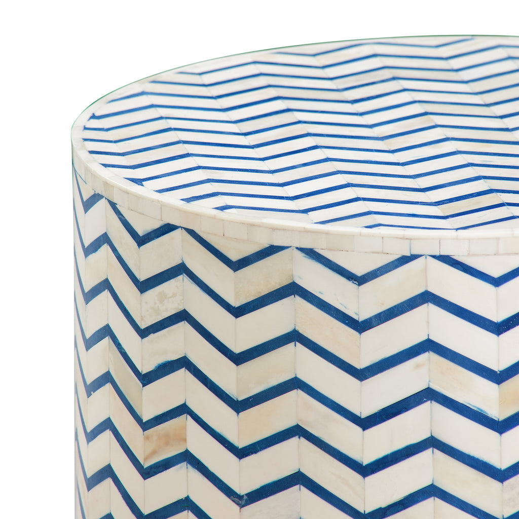 Aden Scatter Table is a round scatter table with a chevron patterning alternating natural bone and blue resin