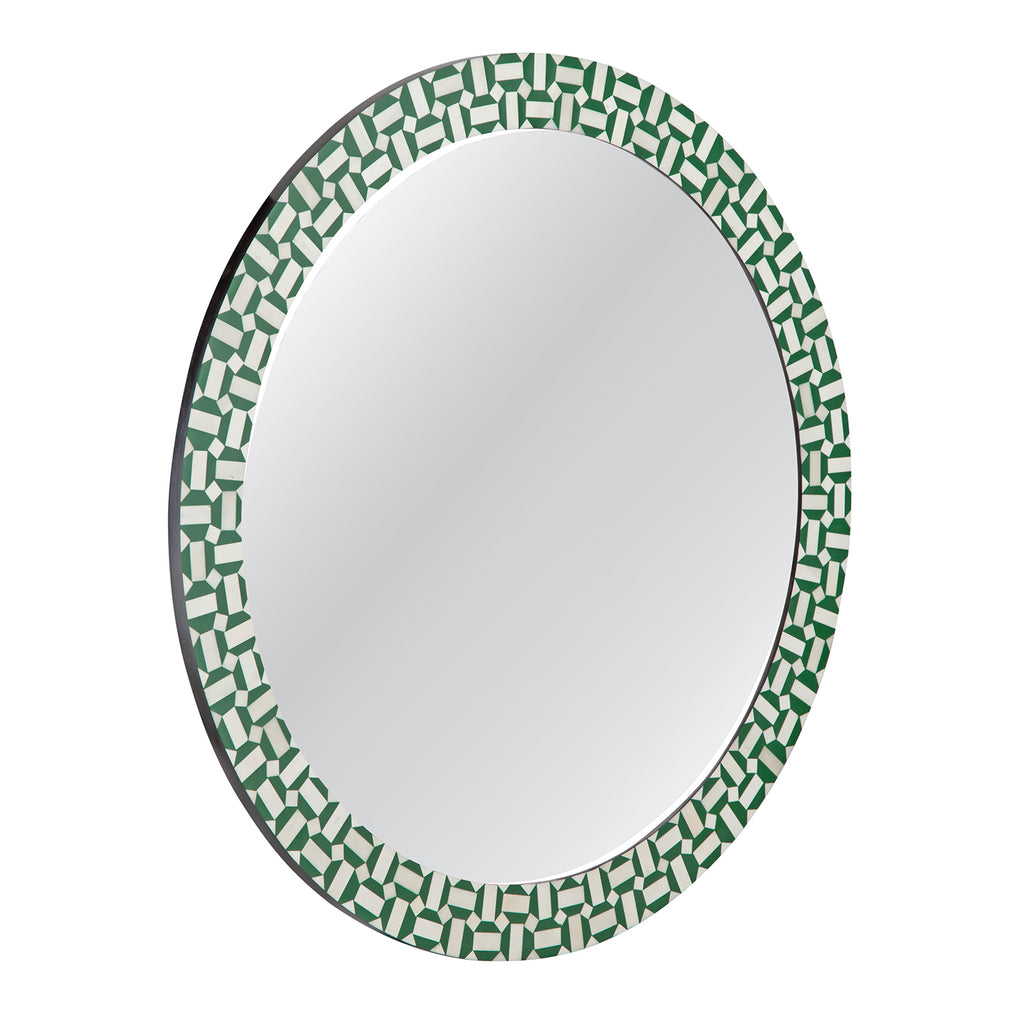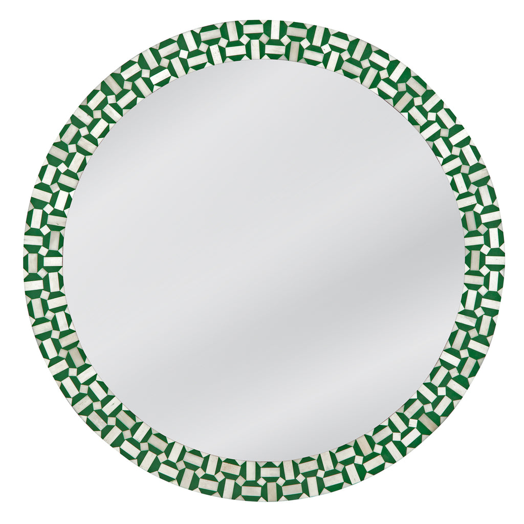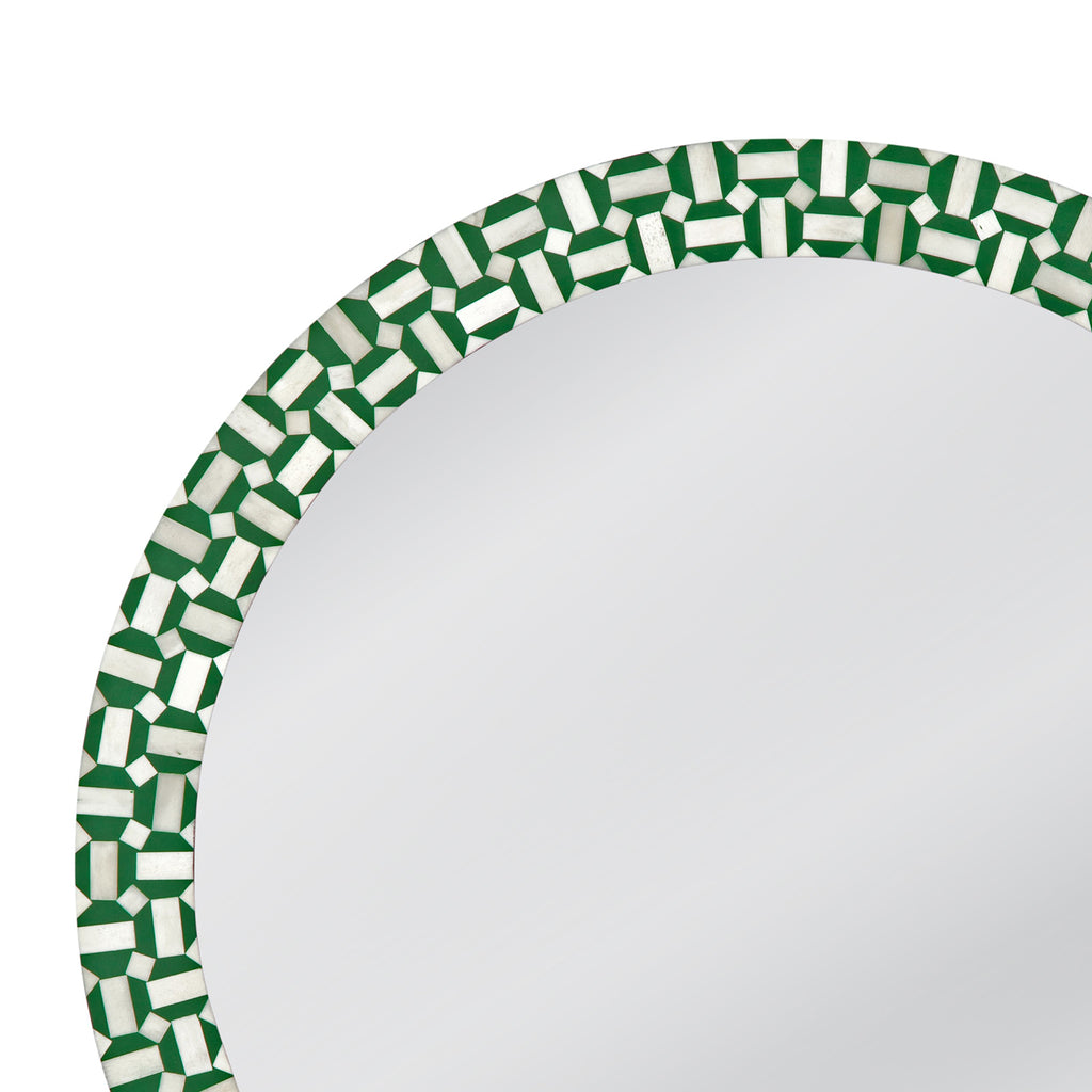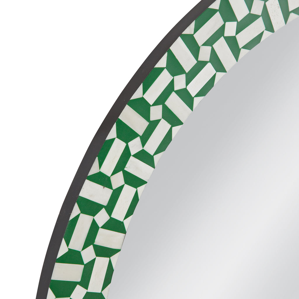 The Alanis Wall Mirror showcases a chic round design, accented with an eye-catching geometric pattern in a vibrant green finish. Its boho-modern aesthetic adds a trendy flair to any space, while the green and cream bone inlay creates a striking contrast for visual appeal. Elevate your decor with this stylish mirror that effortlessly enhances the ambiance of your room, offering a fresh and inviting atmosphere.