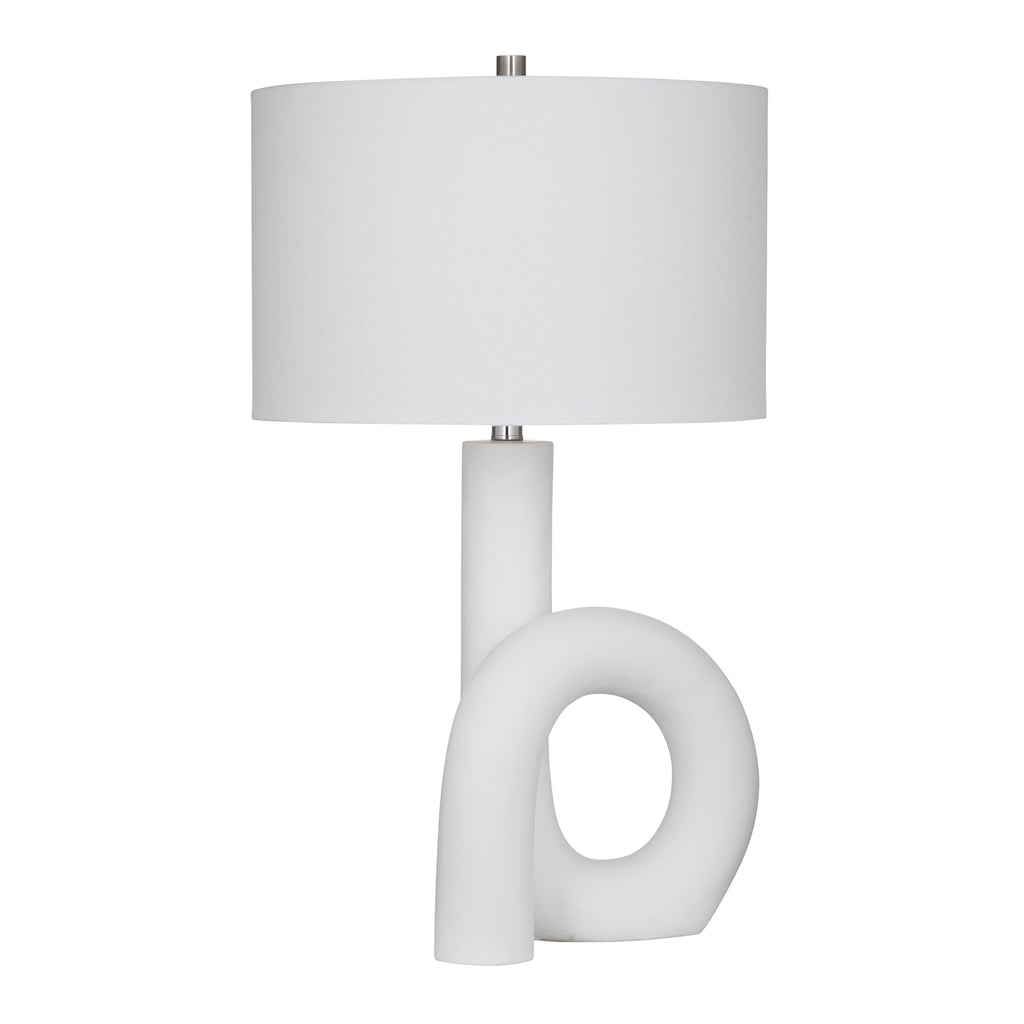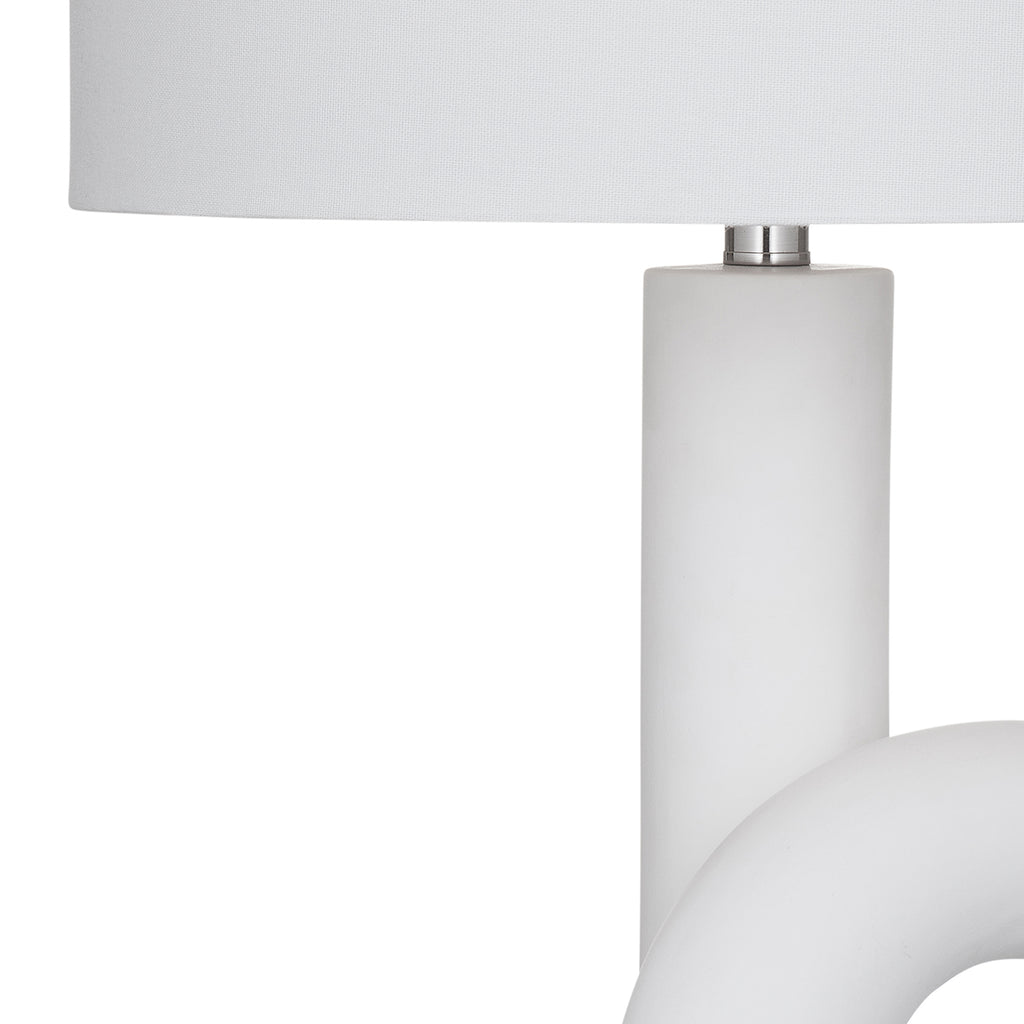 The Alexx Table Lamp features a bold and artistic modern style, with a matte white resin body that curves into an abstract loop, offering a playful yet sophisticated form. Its unique structure acts as a sculptural element, while the uniform matte finish enhances its contemporary appeal. Topped with a white drum shade, the lamp provides a cohesive look that is versatile enough to complement a range of decors, adding a touch of modern artistry to any space.