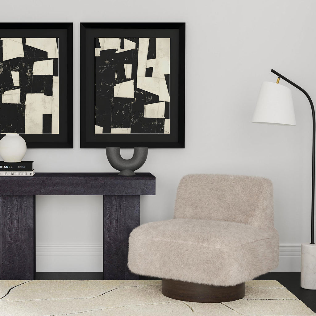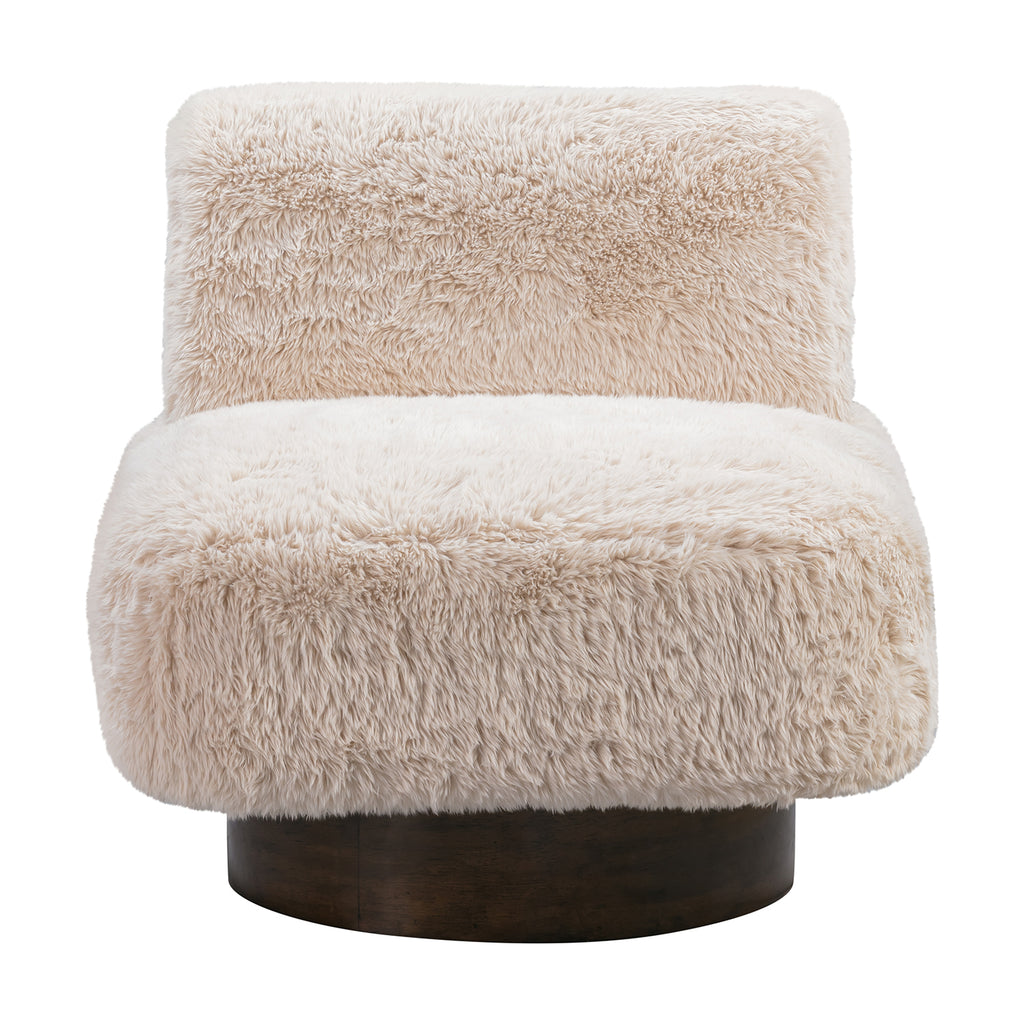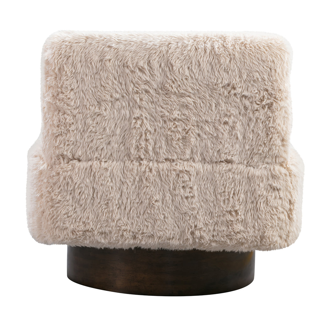 Amaya Swivel Accent Chair is a statement piece with it's funky, modern design features. This upholstered accent chair features a whimsical faux-fur fabric in a neutral sandy beige color. The low profile accent chair sits on a deep oak brown wood ring base, completed with a 360-degree swivel mechanism. The seat and seat back are constructed with a combination of high-density foam and fiber fill for durability and comfort..